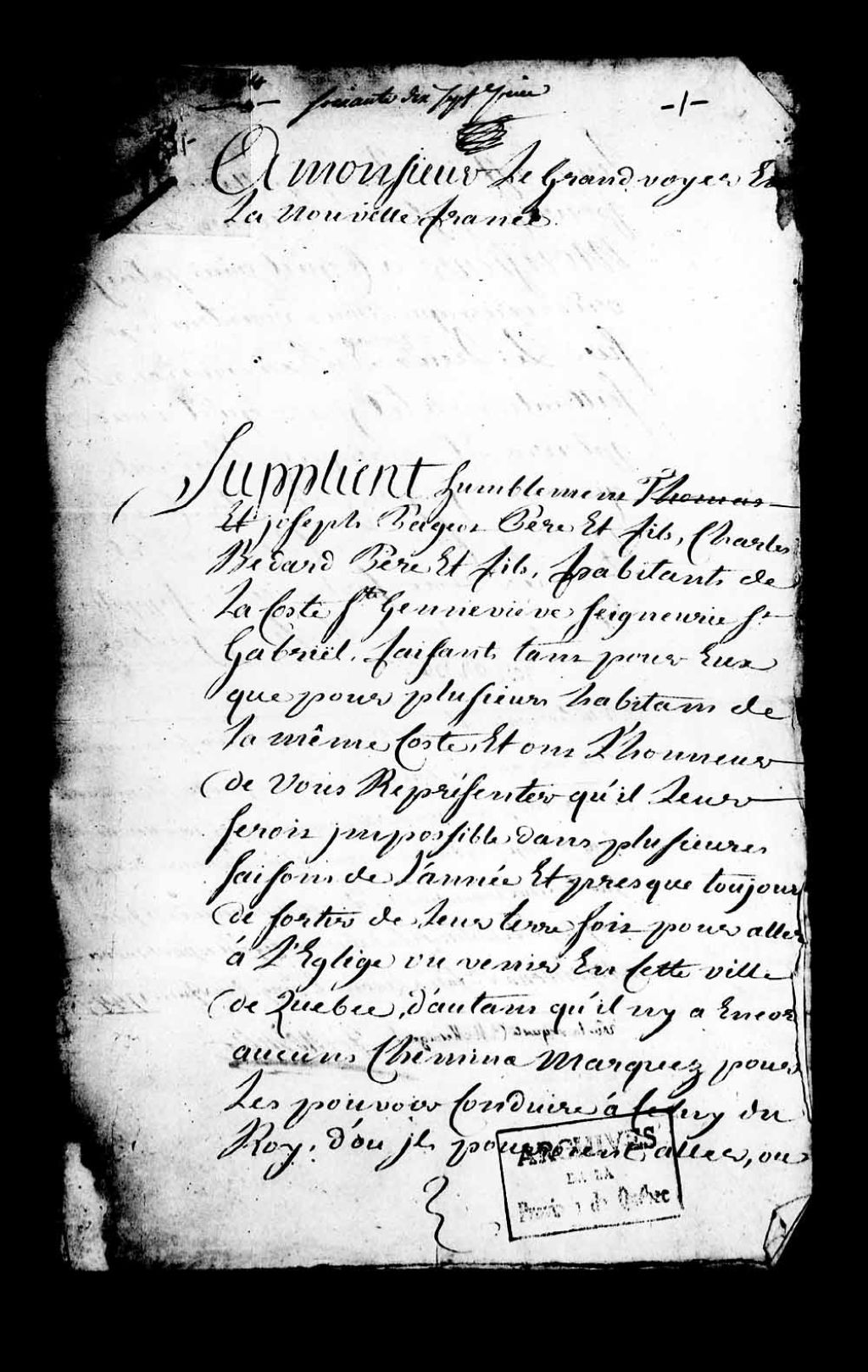 Requête de Joseph Pageot, père et fils, Charles Bédard, père et fils, habitants de la côte Sainte-Geneviève, seigneurie Saint-Gabriel, représentant qu'ils n'ont aucun chemin de sortie pour les conduire au chemin du Roi, 22 juin 1744, Archives nationales à Québec, Collection Pièces judiciaires et notariales, (03Q,TL5,D2691).