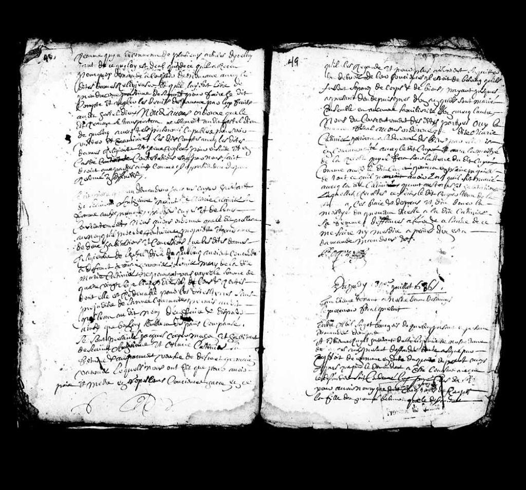 Jugement rendu par le juge prévôt Guillaume Roger à l'effet que les deux habitations détenues par Jacques Caillé, maçon et habitant de Saint-Antoine, et acquises à la suite du mariage dudit Jacques Caillé avec Marie Cartignier, veuve de Germain Vanier, seront remises à Pierre Groleau, représentant et procureur des Révérendes Mères de l'Hôtel-Dieu de Québec, ledit Jacques Caillé étant incapable de payer les redevances seigneuriales (cens et rente) des deux habitations en question, 20 juin 1686, Archives nationales à Québec, Collection Pièces judiciaires et notariales, (03Q,TL5,D2760-77).