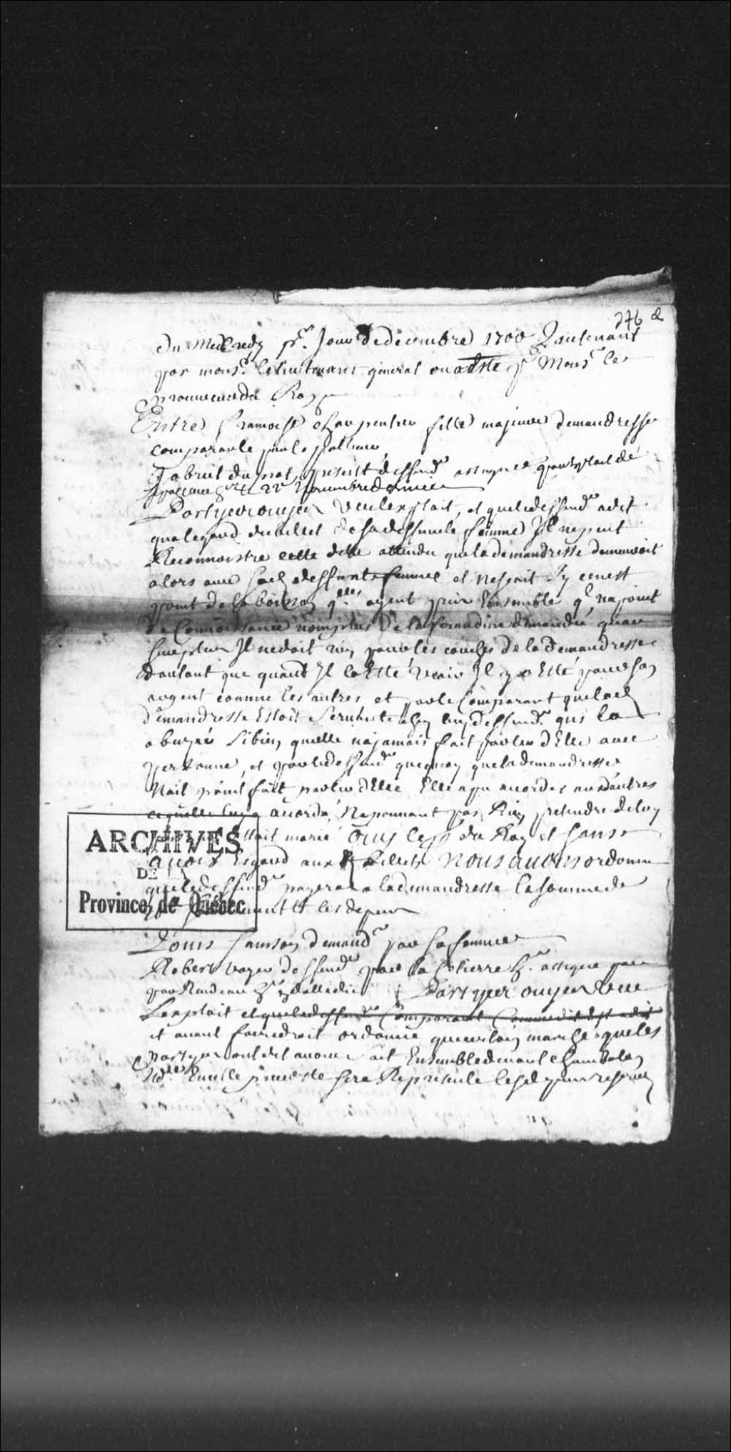 Ordonnance du lieutenant général civil et criminel de la Prévôté de Québec, dans le procès entre messieurs Dupuy et Georges Regnard Duplessis, trésorier en ce pays, concernant une terre dans la seigneurie de Lauzon, 1er décembre 1700, Archives nationales à Québec, Collection Pièces judiciaires et notariales, (03Q,TL5,D276-5).