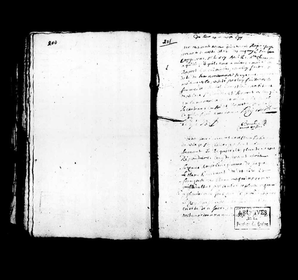 Comparution par-devant Guillaume Roger, juge prévôt de Notre-Dame-des-Anges, du sieur Henri Bélisle, maître chirurgien à Québec, lequel a remis au juge prévôt un rapport par lui fait, en date du 6 novembre 1697, à la suite de la visite à lui faite par la femme de Michel Chrétien, habitant du village de Saint-Claude, et serment pris dudit sieur Henri Bélisle