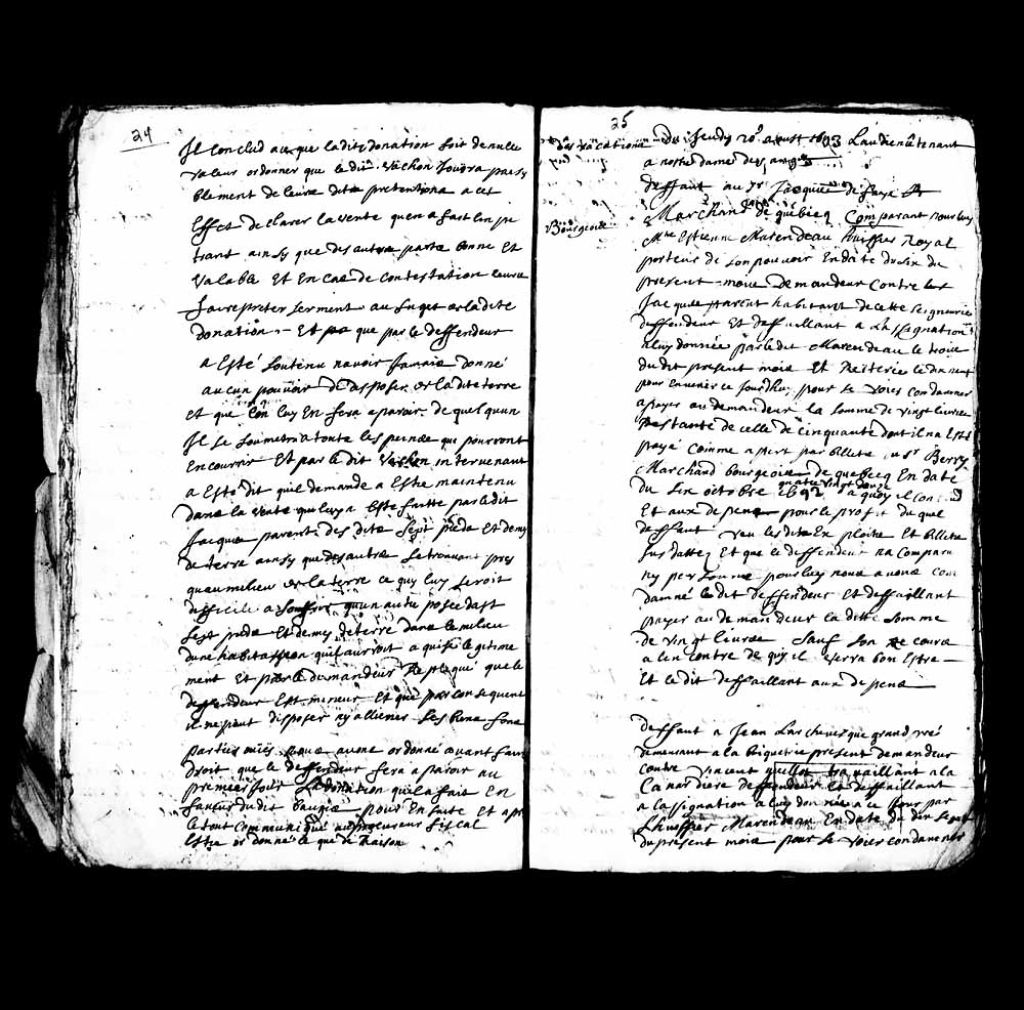 Défaut accordé à Jean Larchevêque dit Grandpré, demeurant à la Briqueterie, et ordonnance de comparution destinée à Vincent Guillot, travaillant à la Canardière, à la suite de la requête pour dettes déposée contre lui par ledit Jean Larchevêque dit Grandpré, 20 août 1693, Archives nationales à Québec, Collection Pièces judiciaires et notariales, (03Q,TL5,D2769-20).