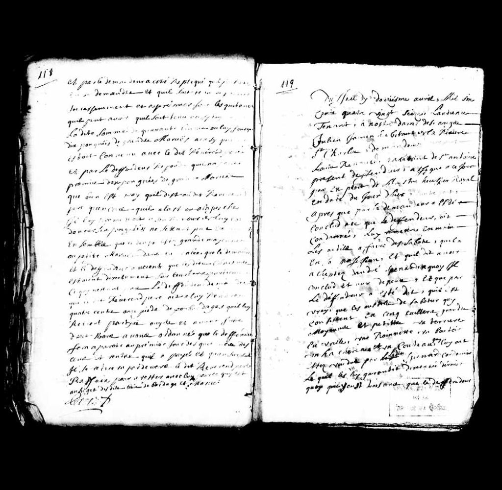 Report de la sentence du juge prévôt Guillaume Roger dans la cause opposant Julien Jamin, habitant de la rivière Saint-Charles, à Louis Renaud, habitant de Saint-Antoine, concernant des outils servant à faire des sabots, ordonnance de comparution destinée à André Spénard (Spennert), cordonnier, et ordonnance à l'effet que les outils mentionnés resteront au greffe de Notre-Dame-des-Anges jusqu'au jugement définitif, 12 avril 1696, Archives nationales à Québec, Collection Pièces judiciaires et notariales, (03Q,TL5,D2769-89).