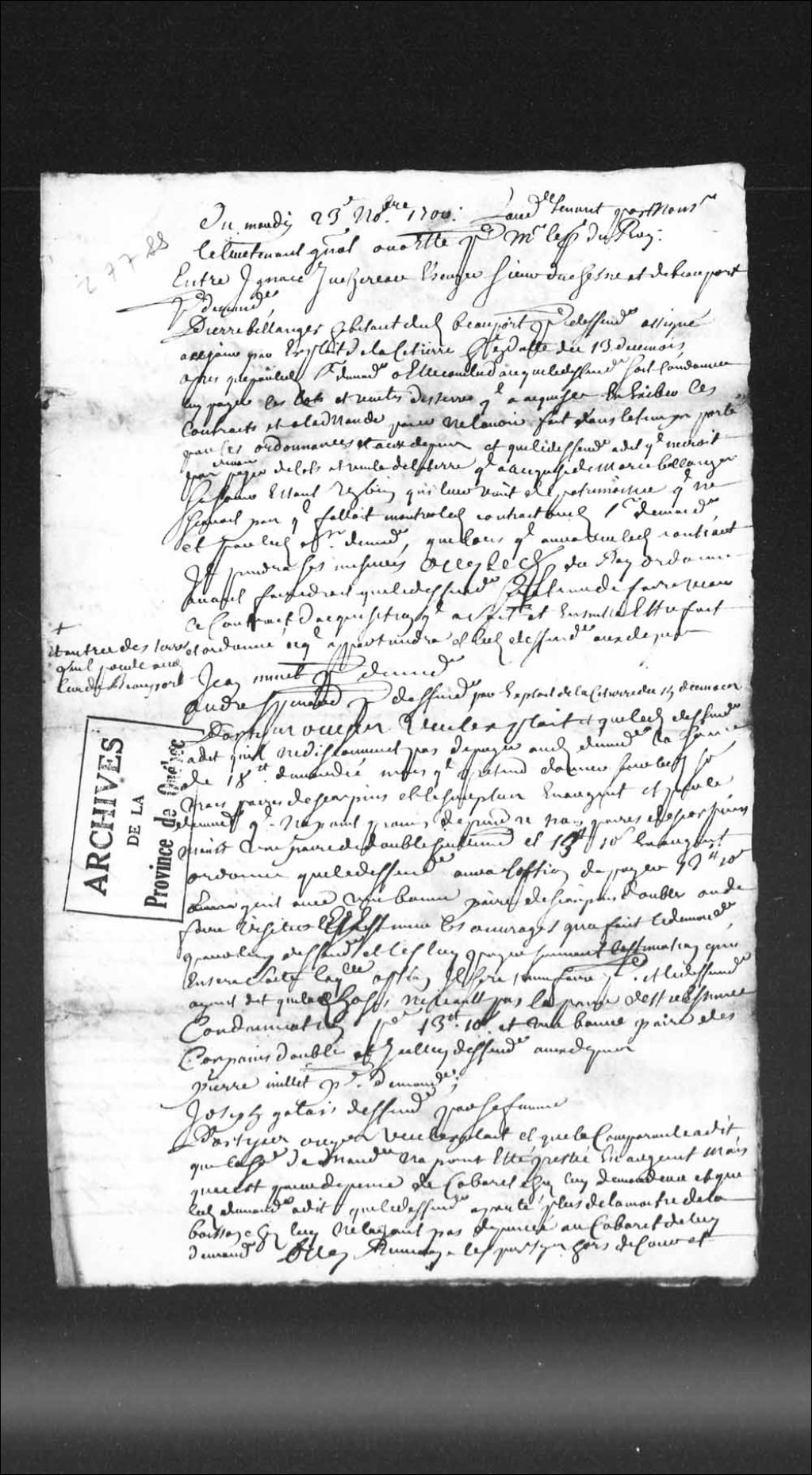 Ordonnance du lieutenant général de la Prévôté de Québec, dans le procès entre Lucien Bouteville (Boutteville), marchand bourgeois de Québec, et Michel Baugis (Beaugis) père, habitant de Beauport, défendeur, qui accorde défaut au demandeur et qui condamne ledit défendeur à payer au demandeur, la somme de 30 livres qu'il lui doit pour les marchandises qu'il lui a livrées, 23 novembre 1700, Archives nationales à Québec, Collection Pièces judiciaires et notariales, (03Q,TL5,D277-106).