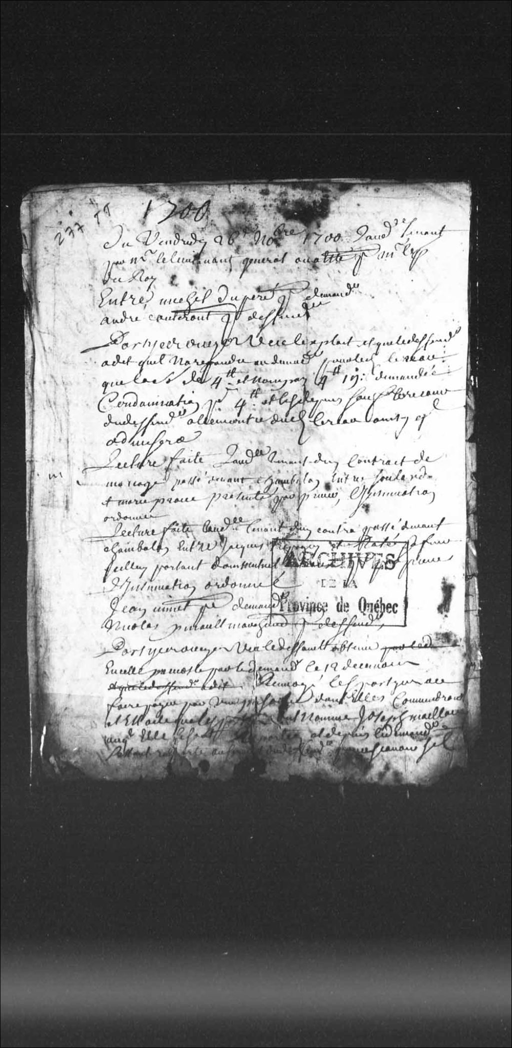 Ordonnance du lieutenant général de la Prévôté de Québec, dans le procès entre Michel Duperé, demandeur et Robert Choret, défendeur, à l'effet qu'il sera fait droit sur la présente requête, après qu'il soit fait droit sur une autre instance entre les parties à la Prévôté, 26 novembre 1700, Archives nationales à Québec, Collection Pièces judiciaires et notariales, (03Q,TL5,D277-114).