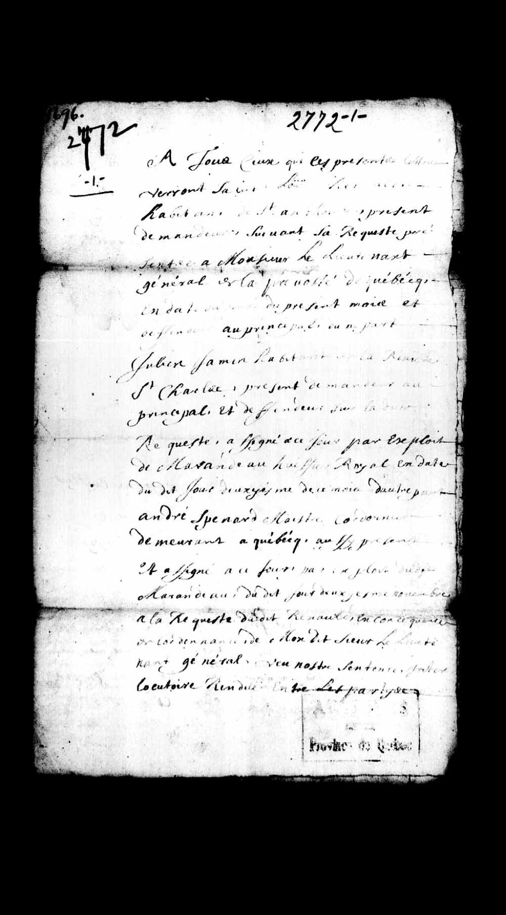 Jugement rendu par le juge prévôt Guillaume Roger en faveur de Louis Renaud, habitant de Saint-Antoine, et de Julien Jamin, habitant de la rivière Saint-Charles, dans la cause les opposant à André Spénard (Spennert), maître cordonnier demeurant à Québec, lequel est condamné à rendre audit Julien Jamin les outils de sabotier qu'il réclame et audit Louis Renaud l'argent qu'il a déboursé pour lesdits outils de sabotier, 8 novembre 1696, Archives nationales à Québec, Collection Pièces judiciaires et notariales, (03Q,TL5,D2772-1).