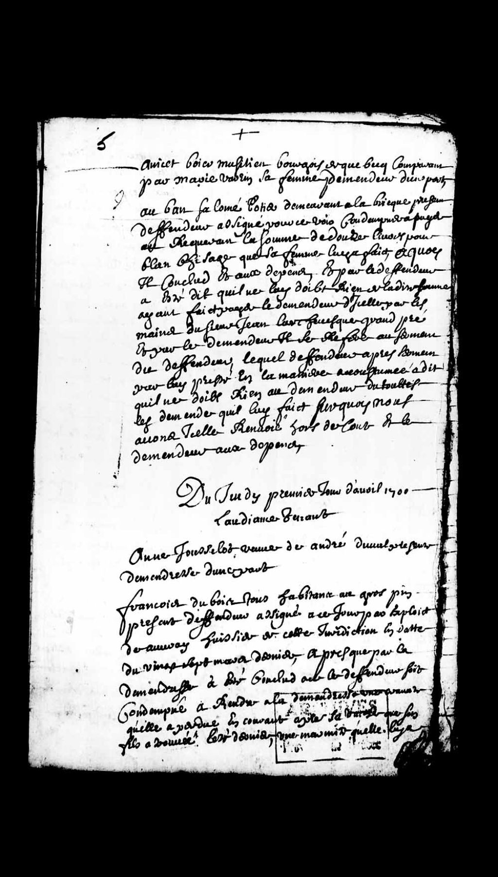 Renvoi hors cour des parties dans la cause opposant Anicet Boyer, musicien et bourgeois de Québec, comparant par sa femme, à Urbain Salomé, potier demeurant à la Briqueterie, ce dernier ayant affirmé sous serment qu'il ne devait rien audit Anicet Boyer, 24 mars 1700, Archives nationales à Québec, Collection Pièces judiciaires et notariales, (03Q,TL5,D2779-6).