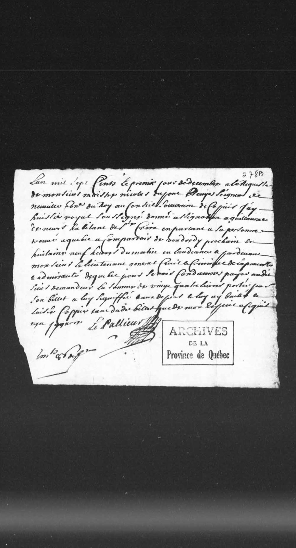 Procès entre Nicolas Dupont, écuyer, sieur de Neuville, conseiller au Conseil supérieur de Québec et Guillaume de Nevers (Denevers), habitant de Sainte-Croix, concernant une somme de 24 livres, 1er décembre 1700, Archives nationales à Québec, Collection Pièces judiciaires et notariales, (03Q,TL5,D278-1).