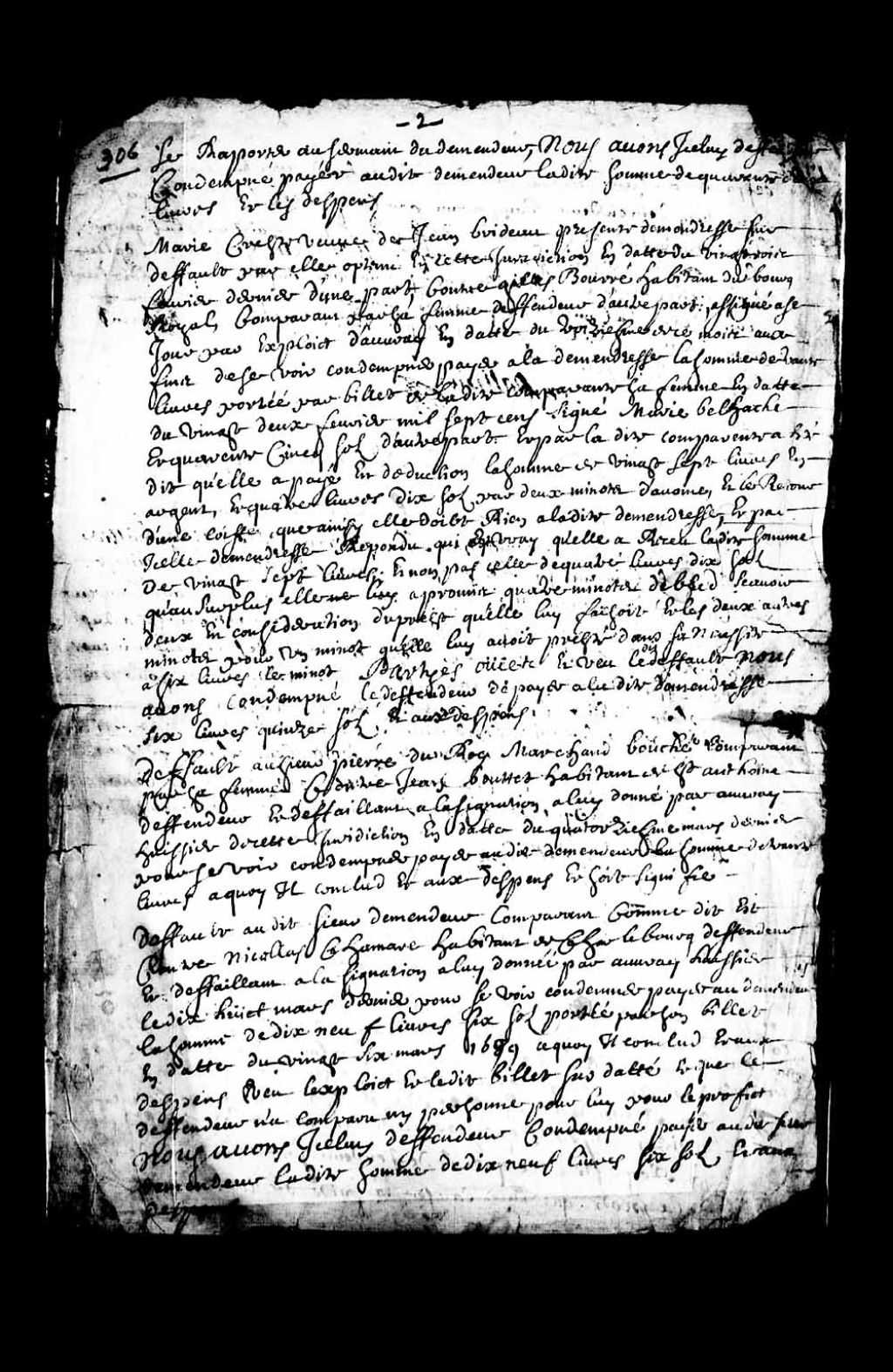 Défaut accordé au sieur Pierre Duroy, marchand boucher, comparant par sa femme, et jugement rendu en sa faveur dans la cause pour dettes l'opposant à Nicolas Chamard, habitant de Charlesbourg, lequel est condamné, en vertu d'un billet fait en date du 26 mars 1689, à verser audit sieur Pierre Duroy la somme de dix-neuf livres et six sols, 1er avril 1702 - 31 mai 1702, Archives nationales à Québec, Collection Pièces judiciaires et notariales, (03Q,TL5,D2785-7).