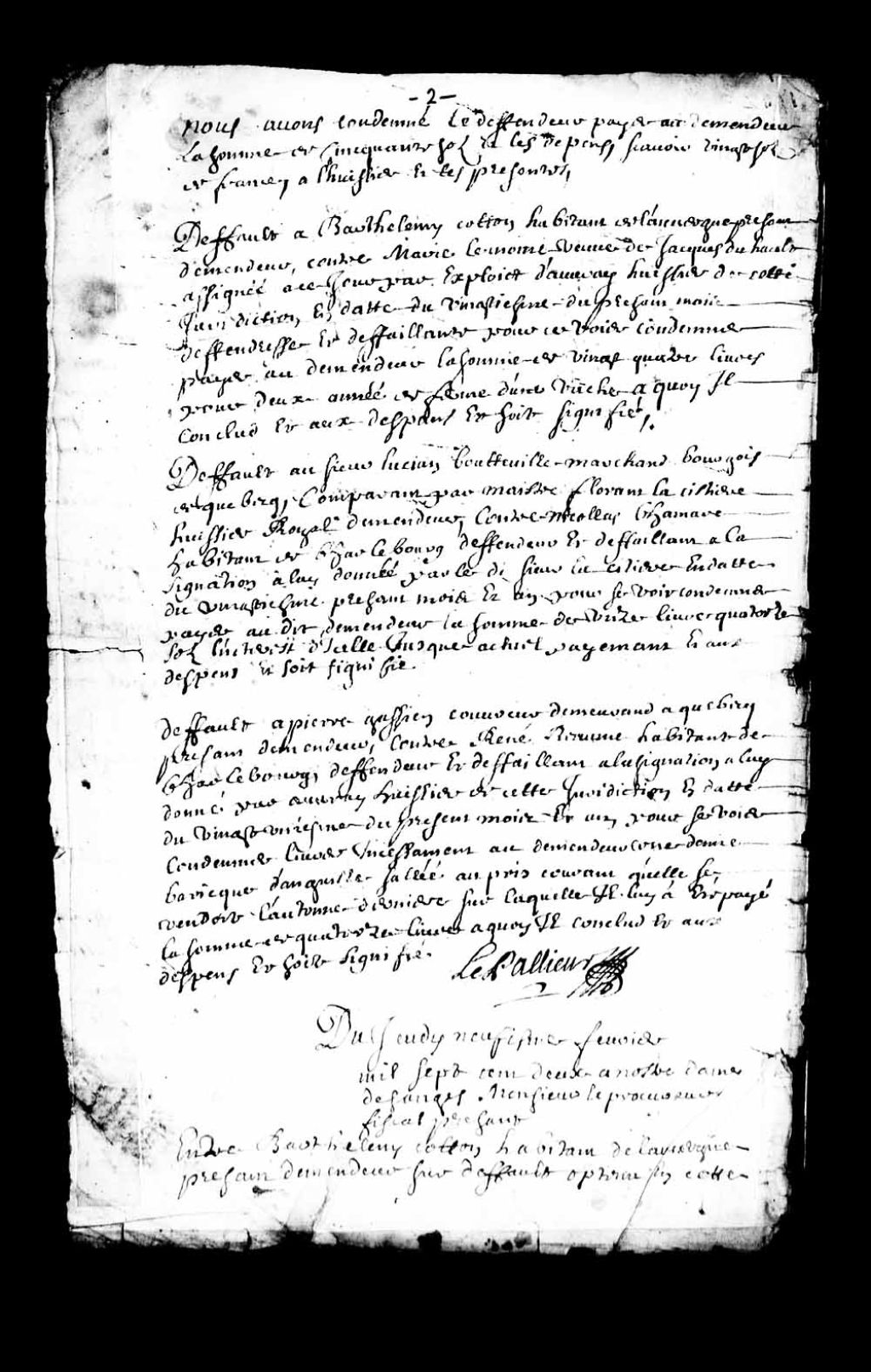 Jugement rendu en faveur de Barthélemi Coton, habitant de L'Auvergne, dans la cause l'opposant à Marie Lemoine, veuve de Jacques Duhault, habitant de Charlesbourg, concernant le paiement par ladite Lemoine de deux années de fermage d'une vache, laquelle Lemoine est condamnée à payer au demandeur la somme de 24 livres pour lesdites deux années de fermage, sauf à elle de justifier qu'elle a déjà payé ladite somme, 9 février 1702, Archives nationales à Québec, Collection Pièces judiciaires et notariales, (03Q,TL5,D2789-6).