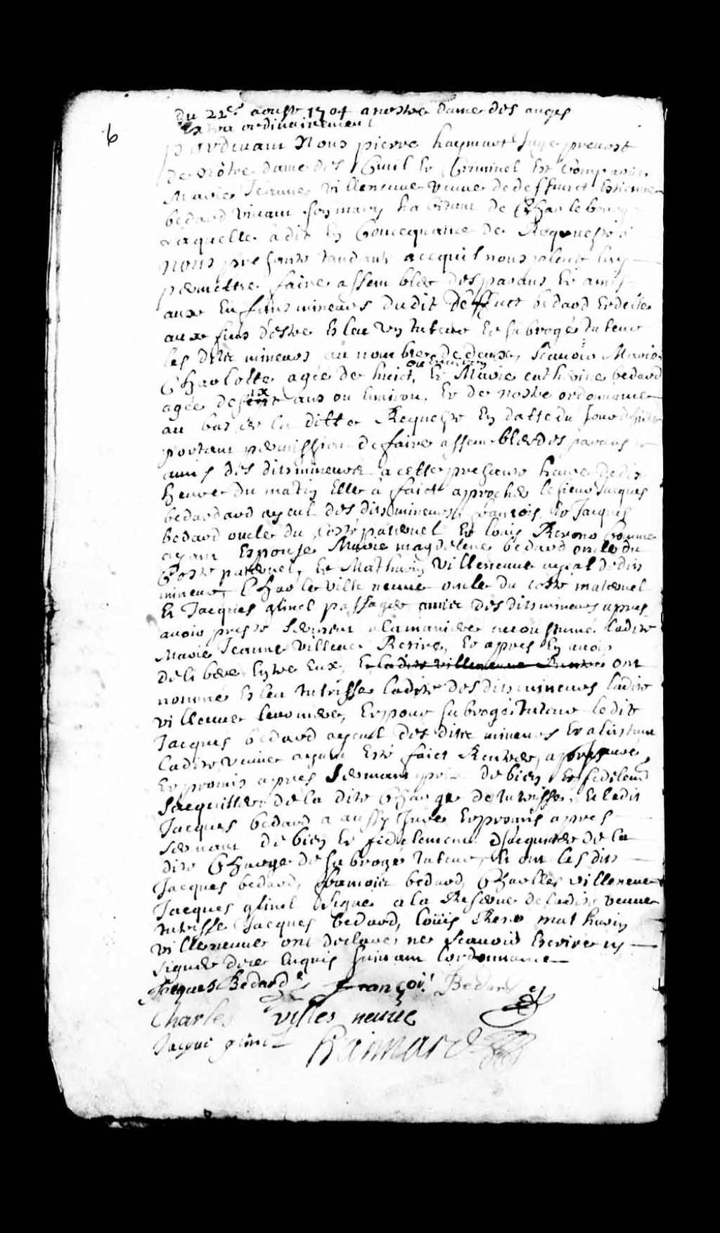 Acte de tutelle concernant Marie-Charlotte (environ 8 ans) et Marie-Catherine (environ 6 ans) Bédard, enfants mineures de Marie-Jeanne Villeneuve et du défunt Étienne Bédard, habitant de Charlesbourg, ladite Villeneuve étant nommée tutrice et Jacques Bédard, aïeul (grand-père) desdits enfants mineurs du côté paternel, étant nommé subrogé tuteur, 22 août 1704, Archives nationales à Québec, Collection Pièces judiciaires et notariales, (03Q,TL5,D2795-7).