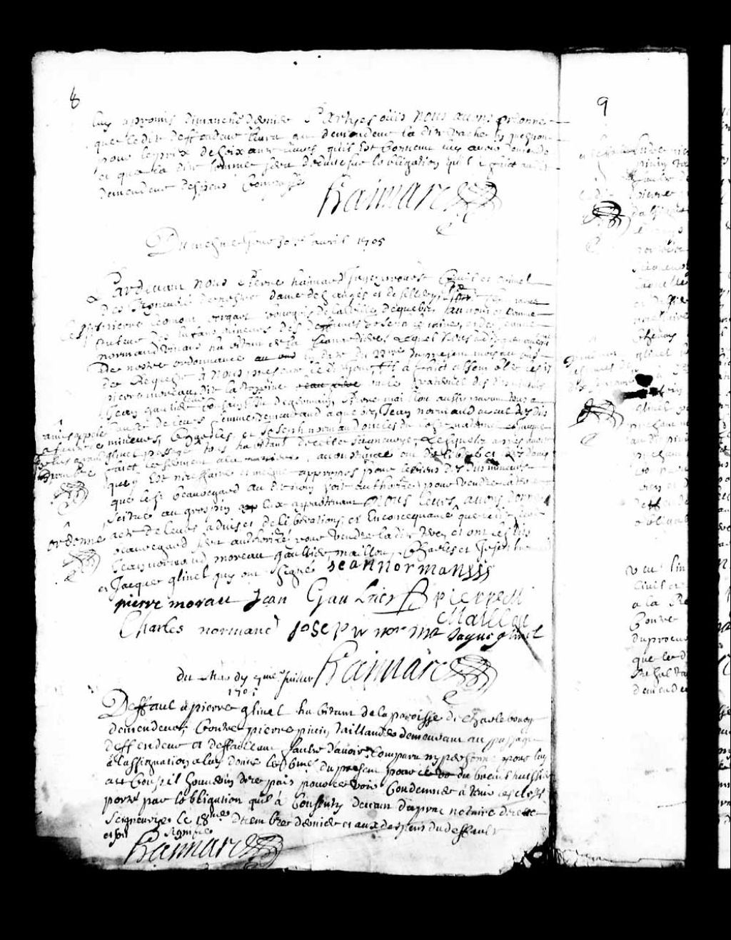 Autorisation donnée au sieur Pierre Glaumont dit Beauregard, bourgeois de Québec, au nom et comme tuteur des enfants mineurs des défunts Joseph Lemire et Jeanne Normand, habitants de la Canardière, de vendre une terre située au Gros-Pin appartenant auxdits enfants mineurs, 30 avril 1705, Archives nationales à Québec, Collection Pièces judiciaires et notariales, (03Q,TL5,D2796-14).