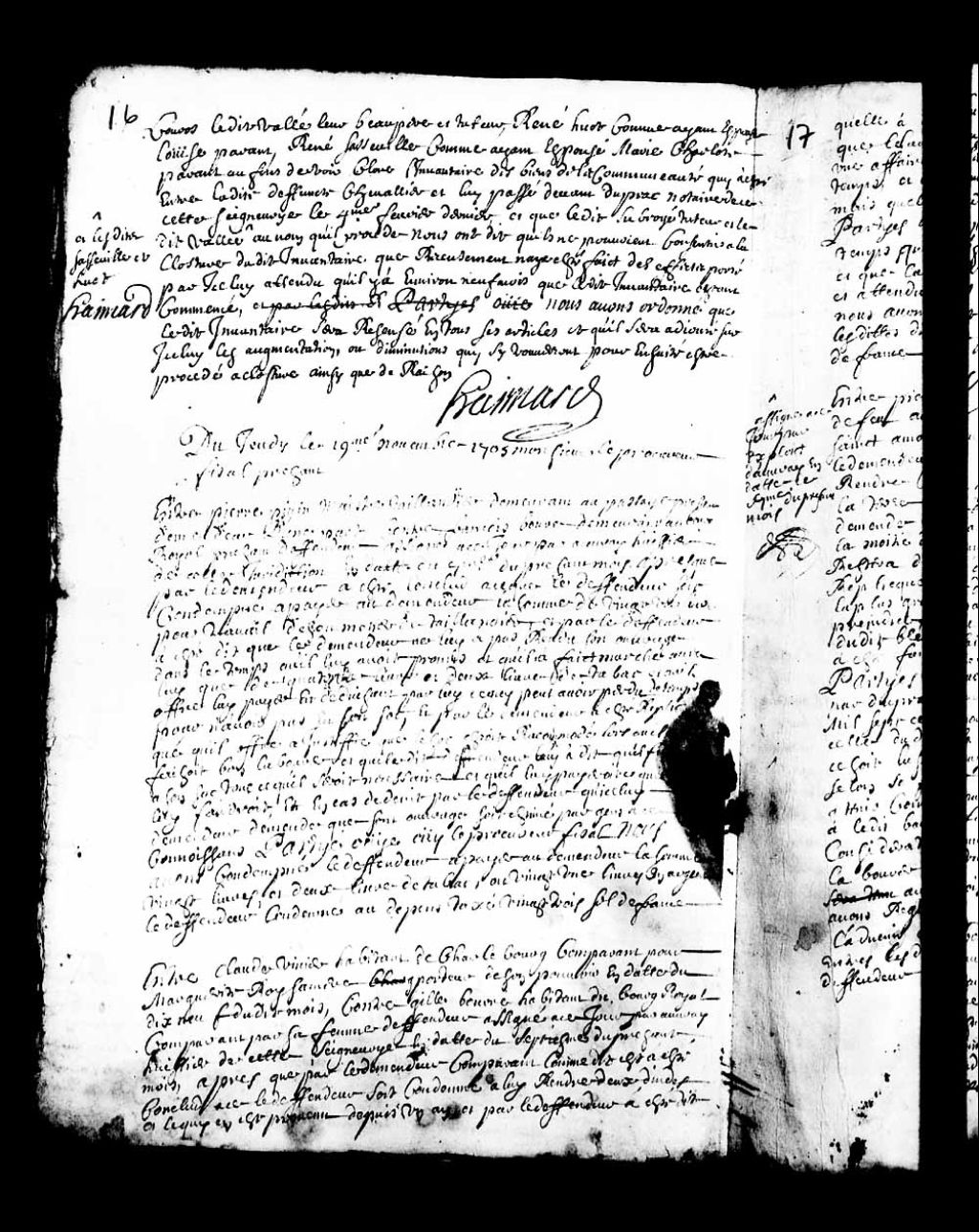Jugement rendu par le juge prévôt Pierre Émard (Haimard) en faveur de Claude Vivier, habitant de Charlesbourg, comparant par Marguerite Roy, sa mère, dans la cause l'opposant à Gilles Bourret (Bourré), habitant du Bourg-Royal, comparant par sa femme, lequel est condamné à rendre audit Claude Vivier deux dindes de l'année, 19 novembre 1705, Archives nationales à Québec, Collection Pièces judiciaires et notariales, (03Q,TL5,D2796-35).