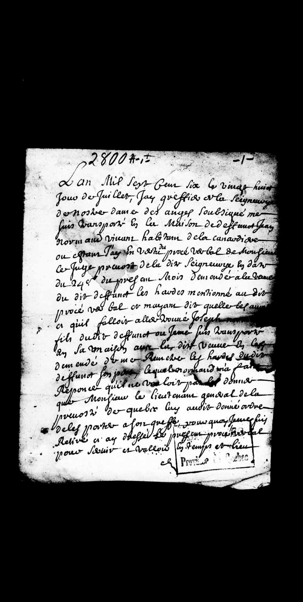 Procès-verbal fait par Duprac, greffier de la seigneurie Notre-Dame-des-Anges, à la suite de sa visite chez le défunt Jean Normand (Lenormand), habitant de la Canardière, et chez Joseph Normand, fils dudit défunt, lequel a affirmé avoir remis les hardes (vêtements) demandées par ledit Duprac au lieutenant général de la Prévôté de Québec, 28 juillet 1706, Archives nationales à Québec, Collection Pièces judiciaires et notariales, (03Q,TL5,D2800A).