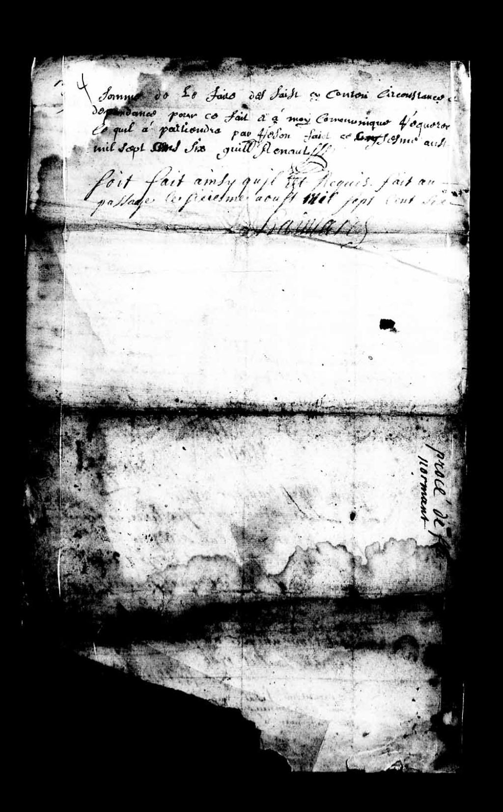 Ordonnance du juge prévôt Pierre Émard (Haimard) à l'effet qu'il en sera fait suivant la requête du procureur fiscal Guillaume Renaud, 6 août 1706, Archives nationales à Québec, Collection Pièces judiciaires et notariales, (03Q,TL5,D2800C-4).