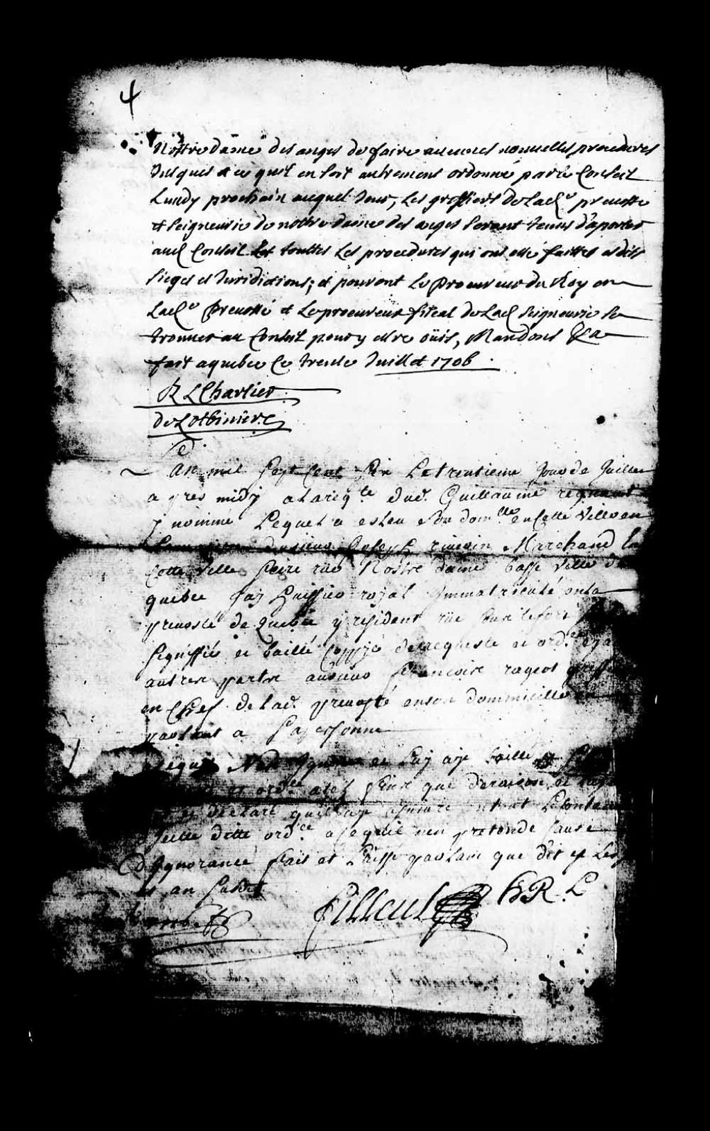 Déclaration de Filleul, huissier royal immatriculé en la Prévôté de Québec, résidant dans la rue Sous-le-Fort, à l'effet qu'il a fourni une copie de la requête du procureur fiscal Guillaume Renaud et une copie de l'ordonnance de René-Louis Chartier, sieur de Lotbinière, concernant le procès relatif à la mort de Jean Normand (Lenormand), au sieur François Rageot, greffier en chef de la Prévôté de Québec, 30 juillet 1706, Archives nationales à Québec, Collection Pièces judiciaires et notariales, (03Q,TL5,D2800D-3).