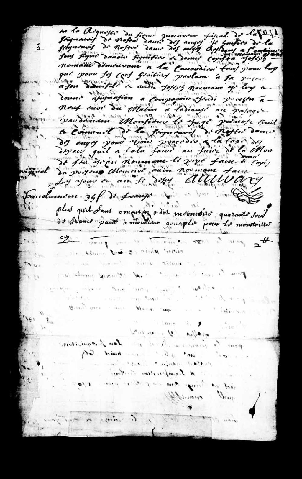 Déclaration de Auvray, huissier de la seigneurie Notre-Dame-des-Anges, à l'effet qu'il a remis une assignation à comparaître à Joseph Normand, demeurant à la Canardière, tant pour lui que pour les autres cohéritiers du défunt Jean Normand (Lenormand) (père), afin de lui réclamer les dépens du procès relatif au décès dudit défunt, 21 novembre 1707, Archives nationales à Québec, Collection Pièces judiciaires et notariales, (03Q,TL5,D2800M-2).