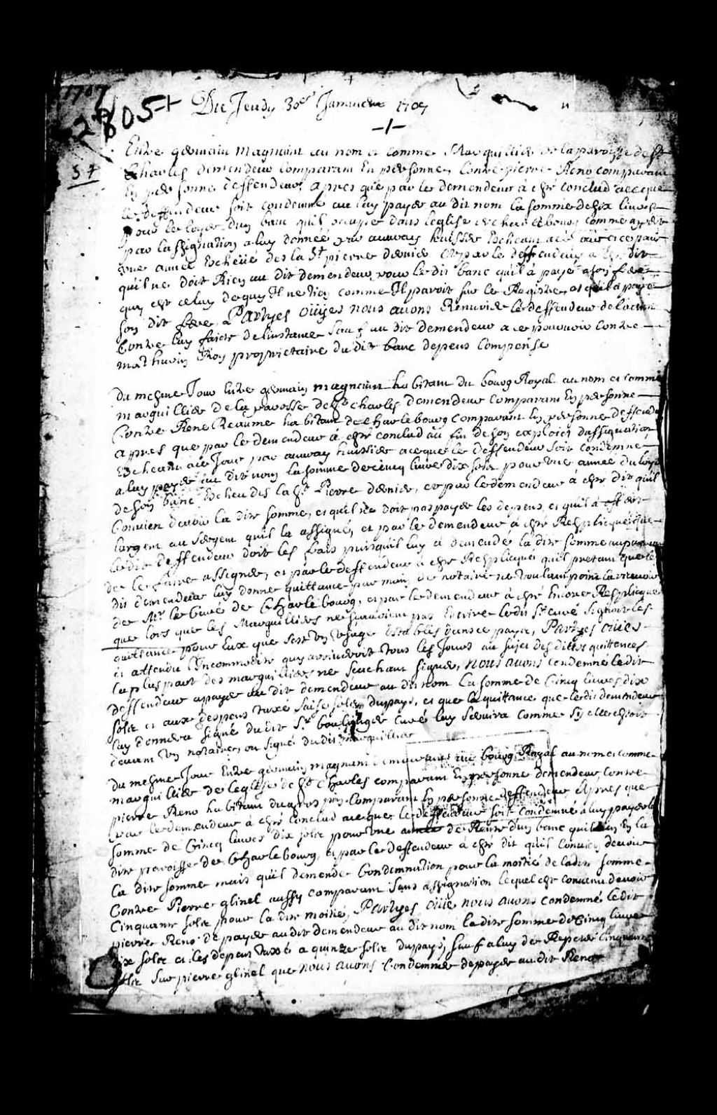 Renvoi par le juge prévôt Pierre Émard (Haimard) de l'action intentée par Germain Magnan, demandeur au nom et comme marguillier de la paroisse de Saint-Charles, contre Pierre Renaud, concernant des arrérages sur le loyer d'un banc occupé par ledit Pierre Renaud en l'église de Charlesbourg, 30 janvier 1707, Archives nationales à Québec, Collection Pièces judiciaires et notariales, (03Q,TL5,D2805-1).