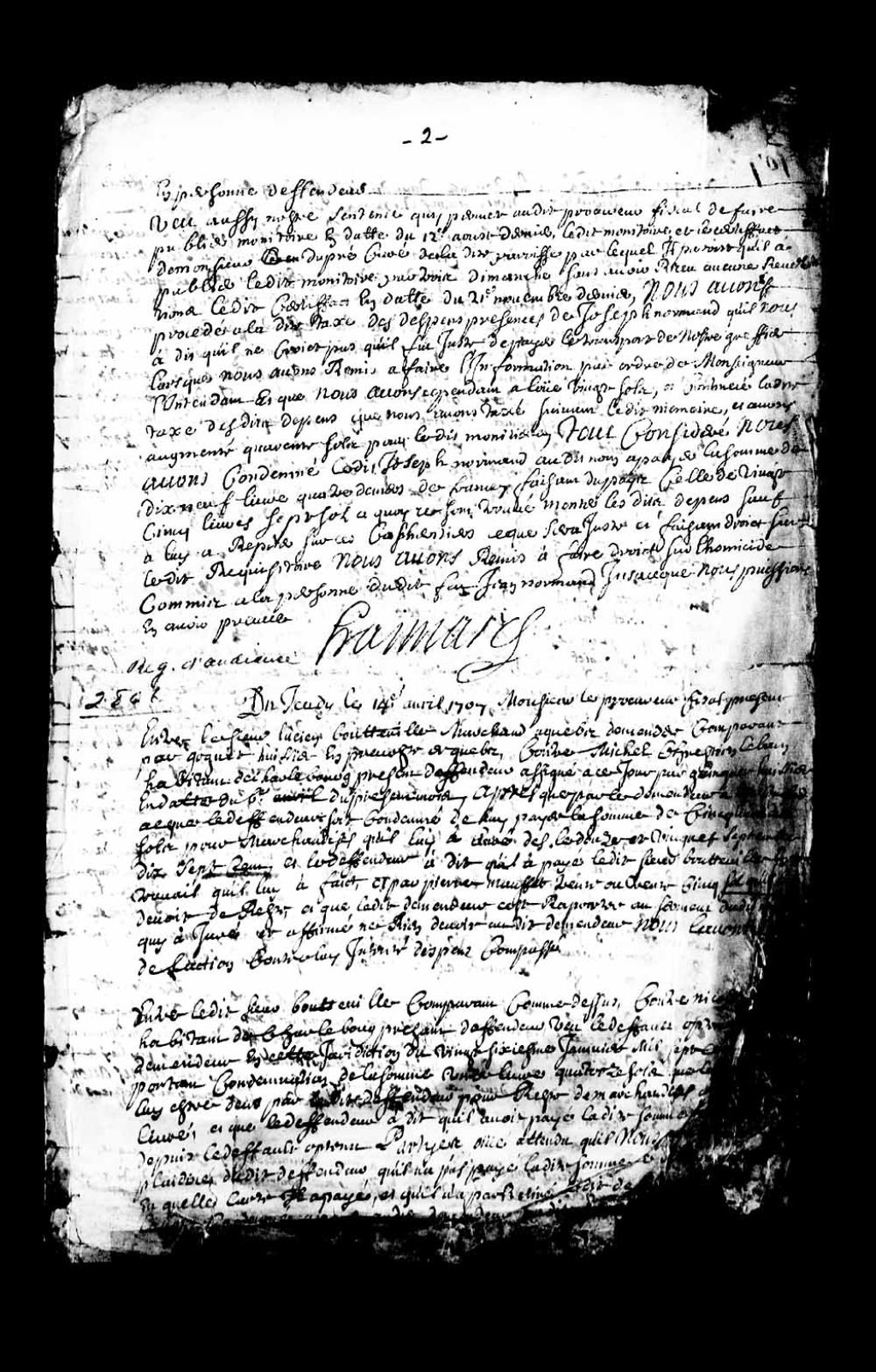 Jugement rendu par le juge prévôt Pierre Émard (Haimard) en faveur du procureur fiscal de la seigneurie Notre-Dame-des-Anges dans la cause l'opposant à Joseph Normand, habitant de la Canardière, défendeur tant pour lui que pour les autres cohéritiers du défunt Jean Normand (Lenormand), lequel est condamné à verser audit procureur fiscal la somme de dix-neuf livres et quatre deniers de France, soit vingt-cinq livres et sept sols de ce pays, pour les dépens du procès relatif au décès dudit Jean Normand, et report du jugement en ce qui concerne l'homicide (assassinat, meurtre) dudit Jean Normand jusqu'à ce qu'il y ait des preuves, 24 mars 1707, Archives nationales à Québec, Collection Pièces judiciaires et notariales, (03Q,TL5,D2806-1).