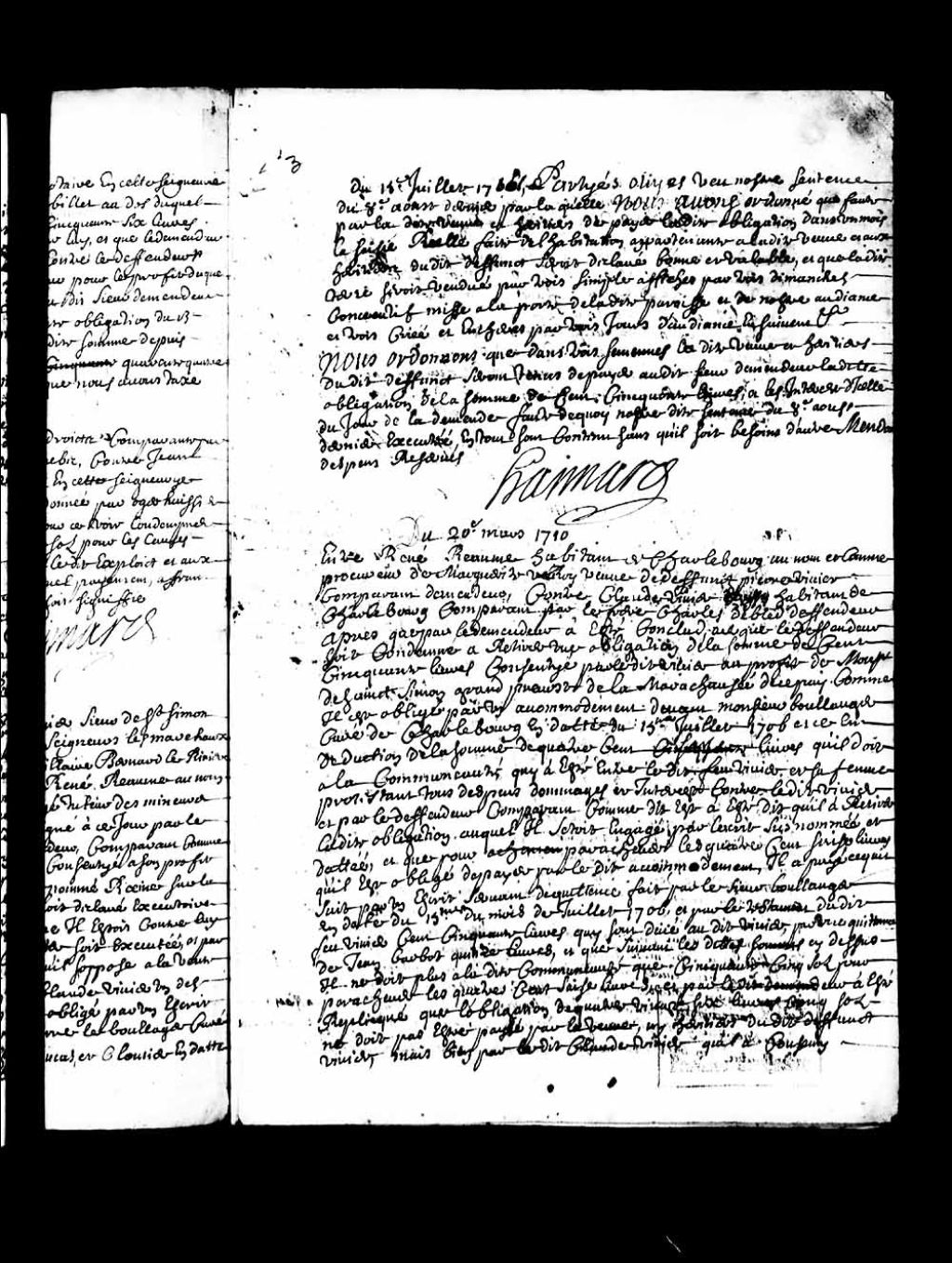 Jugement rendu par le juge prévôt Pierre Émard (Haimard) en faveur de René Réaume, habitant de Charlesbourg, demandeur au nom et comme procureur de Marguerite Roy, veuve du défunt Pierre Vivier, dans la cause l'opposant à Claude Vivier, aussi habitant de Charlesbourg, lequel est condamné à verser audit Réaume au nom de ladite veuve 55 sols qu'il doit à la communauté entre ledit défunt et ladite veuve, et à produire la quittance qu'il dit avoir reçue de Jean Barbeau, à défaut de quoi il paiera 15 livres supplémentaires, 20 mars 1710, Archives nationales à Québec, Collection Pièces judiciaires et notariales, (03Q,TL5,D2816-5).