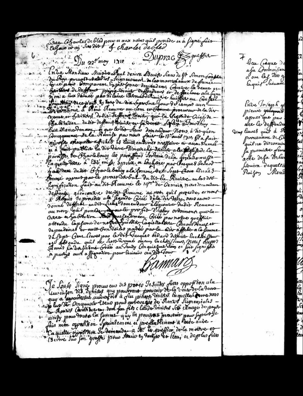 Défaut accordé par le juge prévôt Pierre Émard (Haimard) à maître Paul Denis, écuyer, sieur de Saint-Simon, conseiller du Roi et prévôt de la Maréchaussée, et ordonnance de comparution destinée à René Réaume, comme subrogé tuteur et procureur des enfants mineurs du défunt Pierre Vivier, à la suite de la requête déposée contre lui et contre les héritiers dudit Pierre Vivier par ledit maître Denis, et ordonnance à l'effet que la troisième criée de la terre et de l'habitation appartenant auxdits héritiers aura lieu le jeudi 5 juin 1710, 22 mai 1710, Archives nationales à Québec, Collection Pièces judiciaires et notariales, (03Q,TL5,D2816-9).