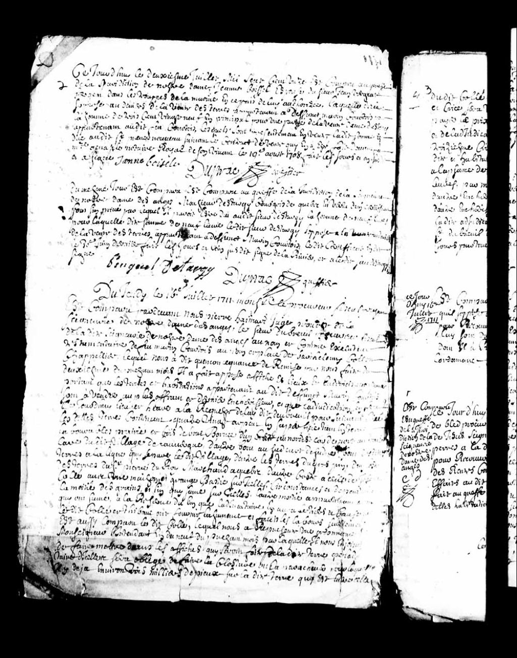 Procès-verbal du juge prévôt Pierre Émard (Haimard) à la suite de la troisième criée concernant la terre et l'habitation situées au village de L'Auvergne appartenant à la succession du défunt Marin Courtois, et ordonnance à l'effet que l'adjudication desdites terre et habitation aura lieu dans quinze jours, 16 juillet 1711, Archives nationales à Québec, Collection Pièces judiciaires et notariales, (03Q,TL5,D2818A-5).