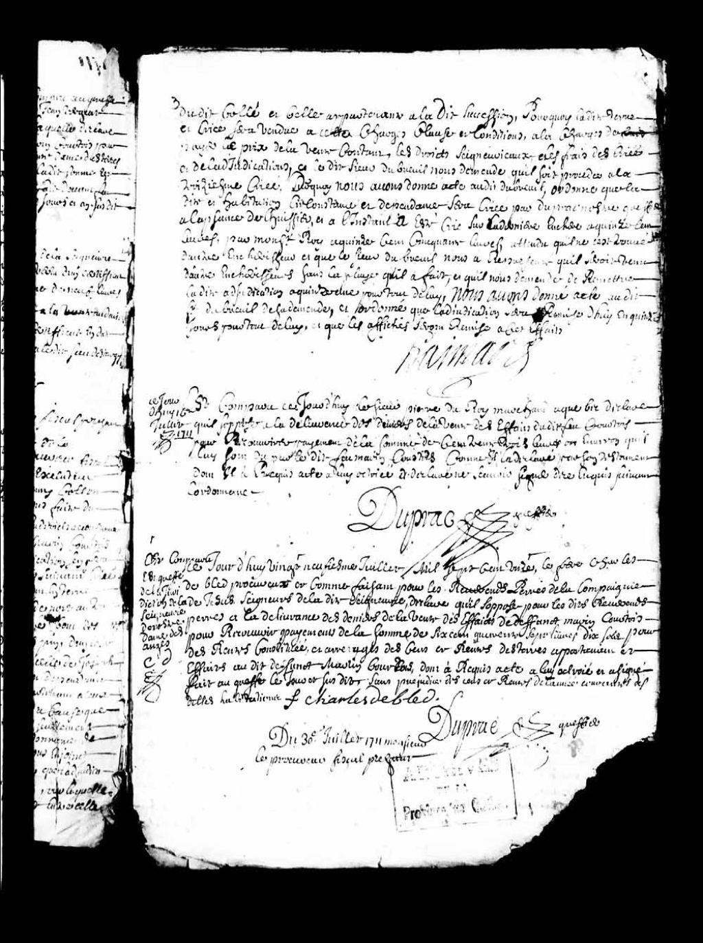 Opposition du frère Charles Deblé, au nom et comme procureur des Révérends Pères de la Compagnie de Jésus, à la délivrance des deniers provenant de la vente des effets du défunt Marin Courtois, afin de recouvrer le paiement d'arrérages de rentes constituées et de redevances seigneuriales (cens et rente) dus auxdits Révérends Pères par ledit Marin Courtois, 29 juillet 1711, Archives nationales à Québec, Collection Pièces judiciaires et notariales, (03Q,TL5,D2818A-7).