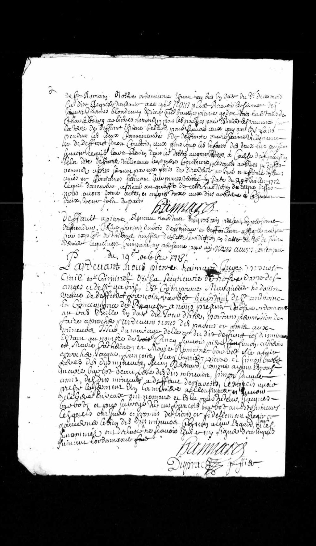 Acte de tutelle concernant Pierre, Simon, Catherine, Marie-Catherine et Marie-Romaine Barbeau, enfants mineurs de Marguerite Hédouin et du défunt François Barbeau, habitant de Saint-Antoine, Jacques Barbeau, frère desdits enfants mineurs, étant nommé tuteur et François Barbeau, aussi leur frère, étant nommé subrogé tuteur, 19 octobre 1713, Archives nationales à Québec, Collection Pièces judiciaires et notariales, (03Q,TL5,D2826-6).