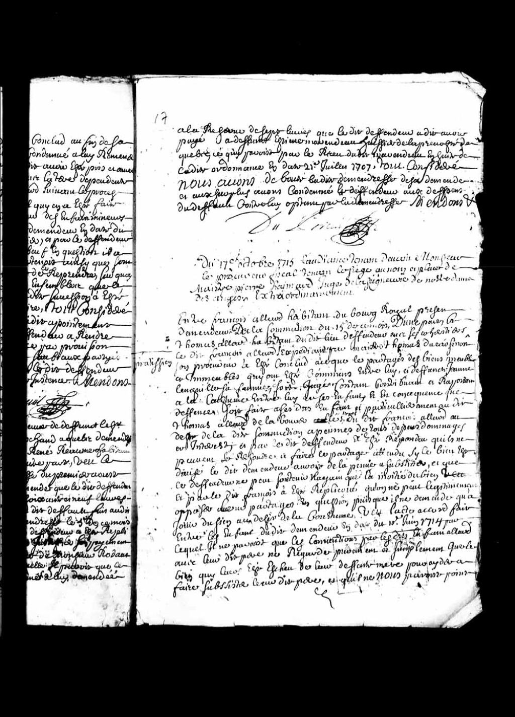 Jugement rendu par le procureur fiscal Étienne Dubreuil en faveur de François Allard, habitant du Bourg-Royal, dans la cause l'opposant à son fils Thomas Allard, aussi habitant dudit lieu, défendeur avec les autres cohéritiers de la défunte Jeanne Languille (Anguille), leur mère, et ordonnance à l'effet qu'il sera fait partage des biens meubles et immeubles de la communauté entre ledit François Allard et ladite défunte, 17 octobre 1715, Archives nationales à Québec, Collection Pièces judiciaires et notariales, (03Q,TL5,D2836-23).