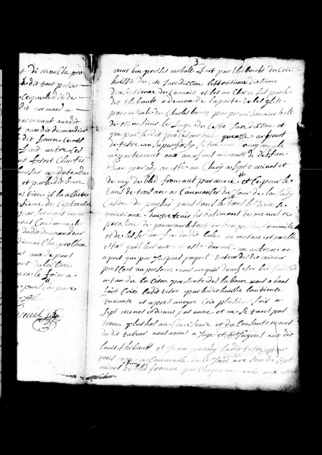 Adjudication à Louis Thibault et à Jean Paradis, pour une période de trois ans et à raison de sept minots et demi de blé de froment par année, d'une terre située au Bourg-Royal appartenant aux enfants mineurs du défunt Jean Paradis, 21 octobre 1717, Archives nationales à Québec, Collection Pièces judiciaires et notariales, (03Q,TL5,D2851-2).