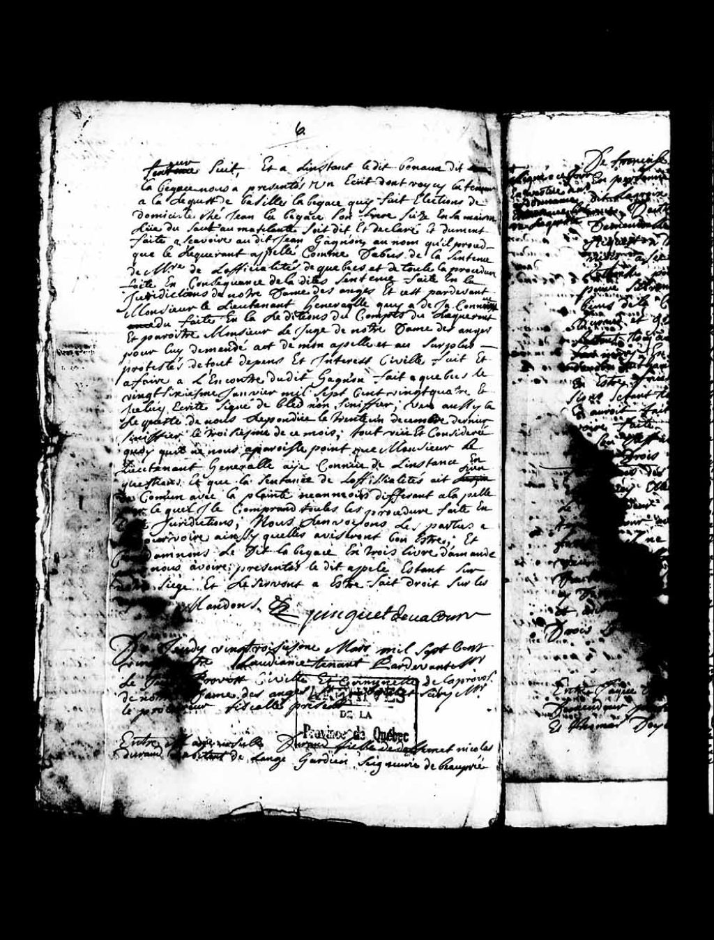 Jugement rendu par le juge prévôt Jacques Pinguet de Vaucourt (Vaucour, Vaucours) en faveur de Marie-Ursule Durand, fille des défunts Nicolas Durand, habitant de L'Ange-Gardien en la seigneurie de Beaupré, et de Françoise Gausse dit Le Borgne, dans la cause l'opposant à Antoine Huppé dit Lagroix, son mari, laquelle Durand est autorisée, malgré le refus de sondit mari, à poursuivre Robert Laberge pour faire valoir ses droits sur la communauté qui a été entre sesdits père et mère, 23 mars 1724, Archives nationales à Québec, Collection Pièces judiciaires et notariales, (03Q,TL5,D2875-4).