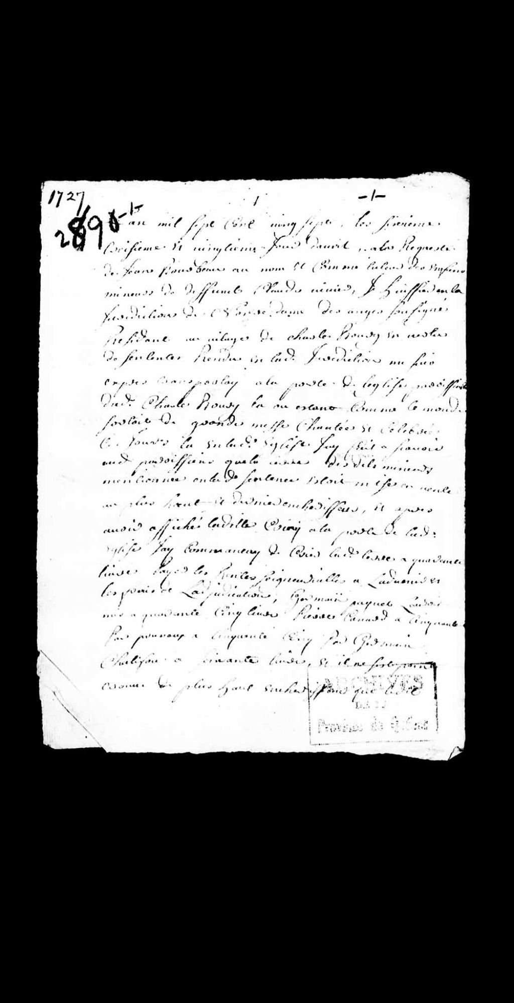 Procès-verbal de Nicolas Jacques, huissier en la juridiction de Notre-Dame-des-Anges, résidant à Charlesbourg, relatant les résultats des trois criées (enchère) qu'il a faites à la porte de l'église paroissiale dudit Charlesbourg, à la requête de Jean Bourbeau, demandeur au nom et comme tuteur des enfants mineurs du défunt Claude Vivier, de la terre appartenant auxdits enfants mineurs, 6 juillet 1727 - 10 juillet 1727, Archives nationales à Québec, Collection Pièces judiciaires et notariales, (03Q,TL5,D2890).