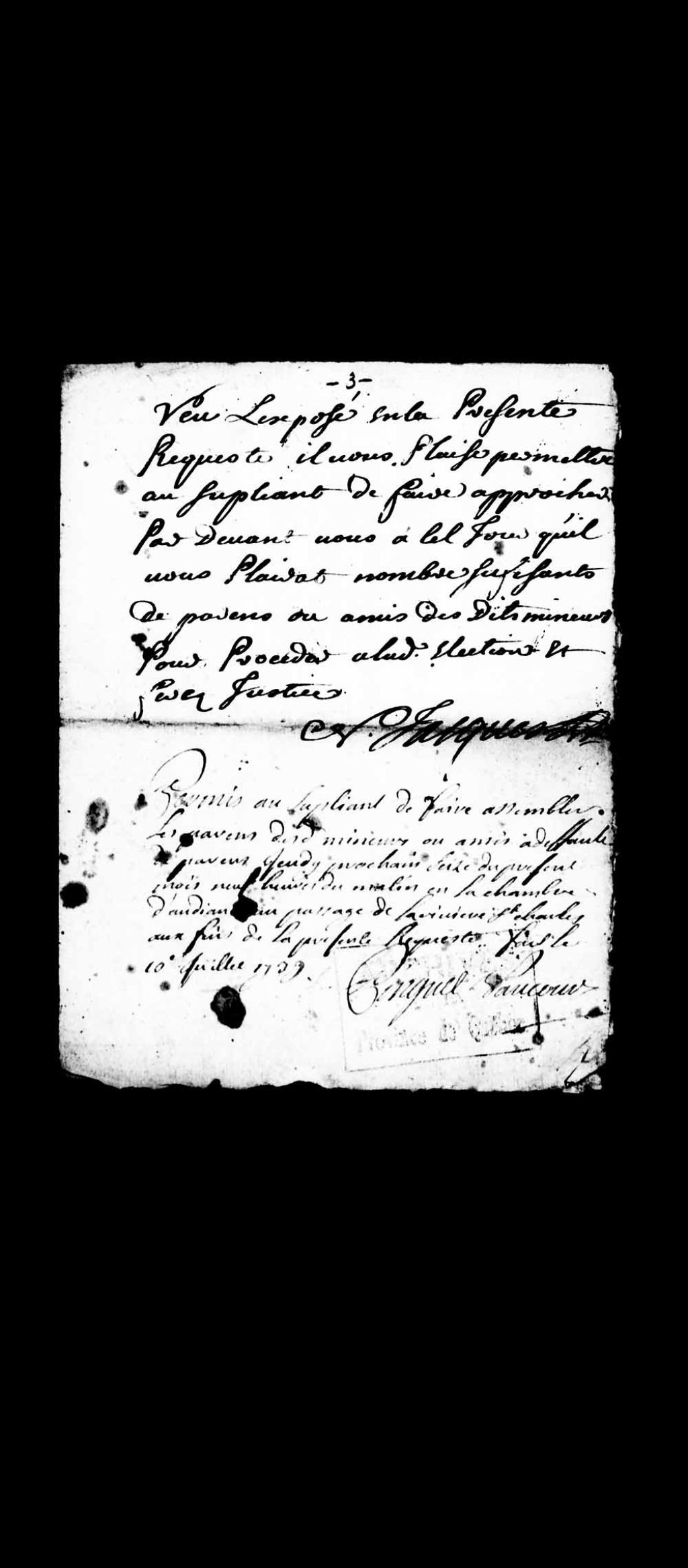 Permission accordée par le juge prévôt Jacques-Nicolas Pinguet de Vaucourt (Vaucour, Vaucours) à Nicolas Jacques, habitant de Charlesbourg et huissier de la juridiction de Notre-Dame-des-Anges, de faire assembler jeudi le 16 juillet 1739, à neuf heures du matin en la chambre d'audience située au passage de la rivière Saint-Charles, un nombre suffisant de parents et amis pour procéder à l'élection d'un tuteur et d'un subrogé tuteur pour ses cinq enfants mineurs
