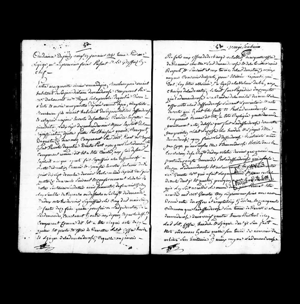 Sentence rendue par le juge prévôt Paul-Antoine-François Lanouillier (Lanoullier), sieur Desgrandes (Desgranges), dabs la cause opposant Marguerite Vivier, veuve de Jean Bourbeau père, habitant de Notre-Dame-des-Anges, à Marie-Marguerite Dupéré, veuve de Jean-Baptiste Bourbeau fils, aussi habitant dudit lieu, concernant l'acte de donation de la demenderesse envers la défenderesse, ordonnance à l'effet que ladite Dupéré devra remettre à la demanderesse dans un délais de 24 heures un lit, un coffre, des hardes et du linge et à l'effet que la demanderesse puisse jouir de la moitié de l'usufruit de sa terre, et nomination de Jean-Baptiste Roy dit Audy à titre d'arbitre, 20 janvier 1751, Archives nationales à Québec, Collection Pièces judiciaires et notariales, (03Q,TL5,D3012-35).