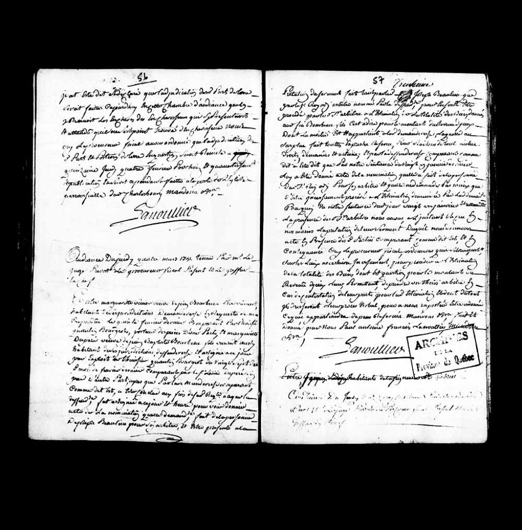 Renvoi hors cour des parties par le juge prévôt Paul-Antoine-François Lanouillier (Lanoullier), sieur Desgrandes (Desgranges), dans l'affaire opposant Marie-Anne Gaudreau, veuve de Jean Valade, habitant de Charlesbourg, à Joseph Dupéré, aussi habitant dudit lieu, lequel ayant offert l'exécution des clauses de la donation de ladite Gaudreau et du défunt Valade à leur fils Pierre Valade dont ledit Dupéré est l'acquéreur, 13 mai 1751, Archives nationales à Québec, Collection Pièces judiciaires et notariales, (03Q,TL5,D3012-39).