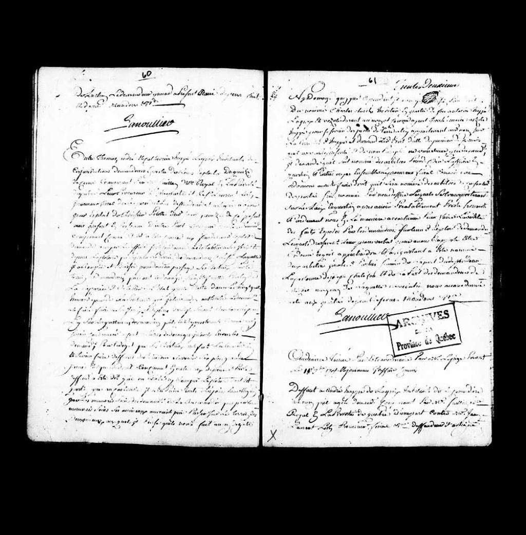 Défaut accordé par le juge prévôt Paul-Antoine-François Lanouillier (Lanoullier), sieur Desgrandes (Desgranges), à André Huppé dit Lagroix, habitant de la Canardière, et ordonnance de comparution destinée à maître Jean Laurent dit Lortie, procureur fiscal, à la suite de la requête déposée contre lui par ledit Huppé, 11 septembre 1751, Archives nationales à Québec, Collection Pièces judiciaires et notariales, (03Q,TL5,D3012-42).
