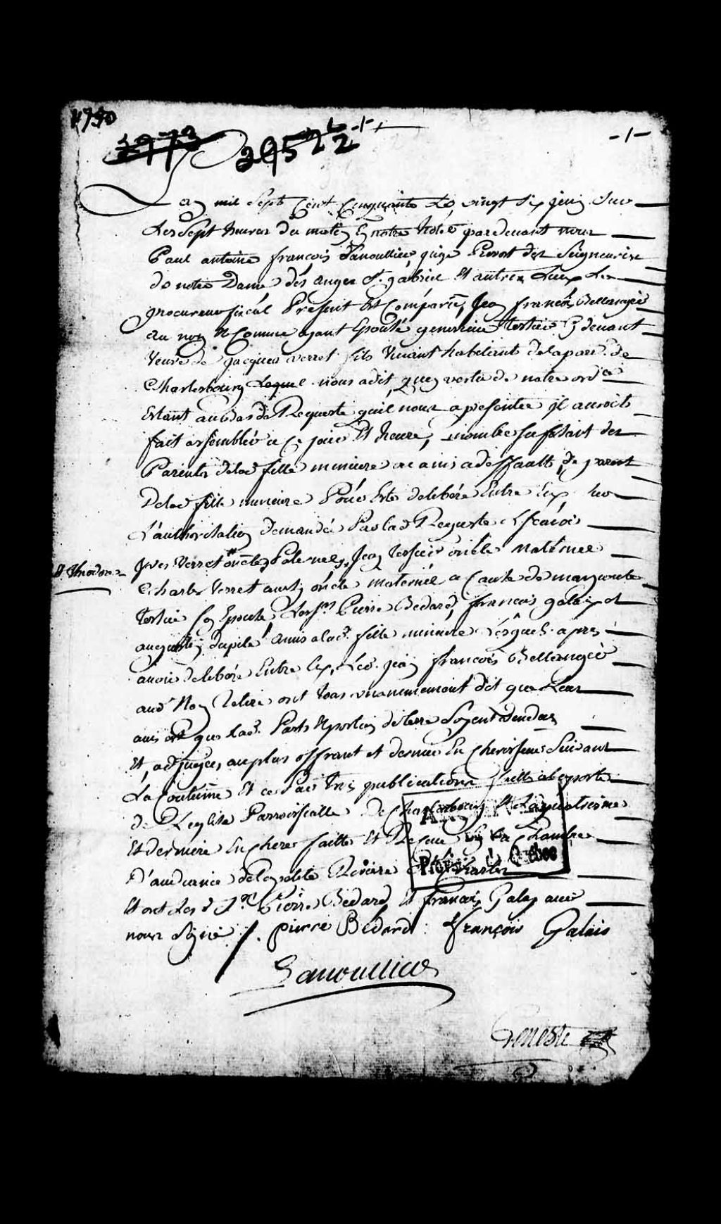 Permission accordée par le juge prévôt Paul-Antoine-François Lanouillier (Lanoullier), sieur Desgrandes (Desgranges), à Jean-François Bélanger, au nom et comme ayant épousé la mineure Geneviève Tessier, veuve en premières noces de Jacques Verret fils, habitant de la paroisse de Charlesbourg, après délibérations des parents et amis de ladite Tessier, de vendre une portion de terre appartenant à ladite Tessier et ordonnance à l'effet que ladite portion de terre soit adjugée au plus offrant et dernier enchérisseur suivant la coutume par trois publications faites à la porte de l'église paroissiale de Charlesbourg, 26 juin 1750, Archives nationales à Québec, Collection Pièces judiciaires et notariales, (03Q,TL5,D3052-4).