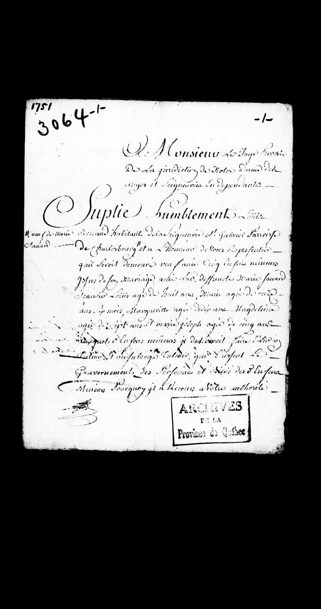 Requête de Louis Renaud, habitant de la paroisse de Charlesbourg en la seigneurie Saint-Gabriel, veuf de Marie Savard, demandant la permission de faire comparaître les parents et amis de Louis Renaud, 8 ans; Marie Renaud, 11 ans et 6 mois; Marguerite Renaud, 10 ans; Madeleine Renaud, 7 ans; et Marie-Josèphe Renaud, 5 ans, enfants mineurs issus de son mariage avec la défunte Savard, dans le but de faire élire un tuteur pour lesdits enfants mineurs, 10 novembre 1751, Archives nationales à Québec, Collection Pièces judiciaires et notariales, (03Q,TL5,D3064-1).