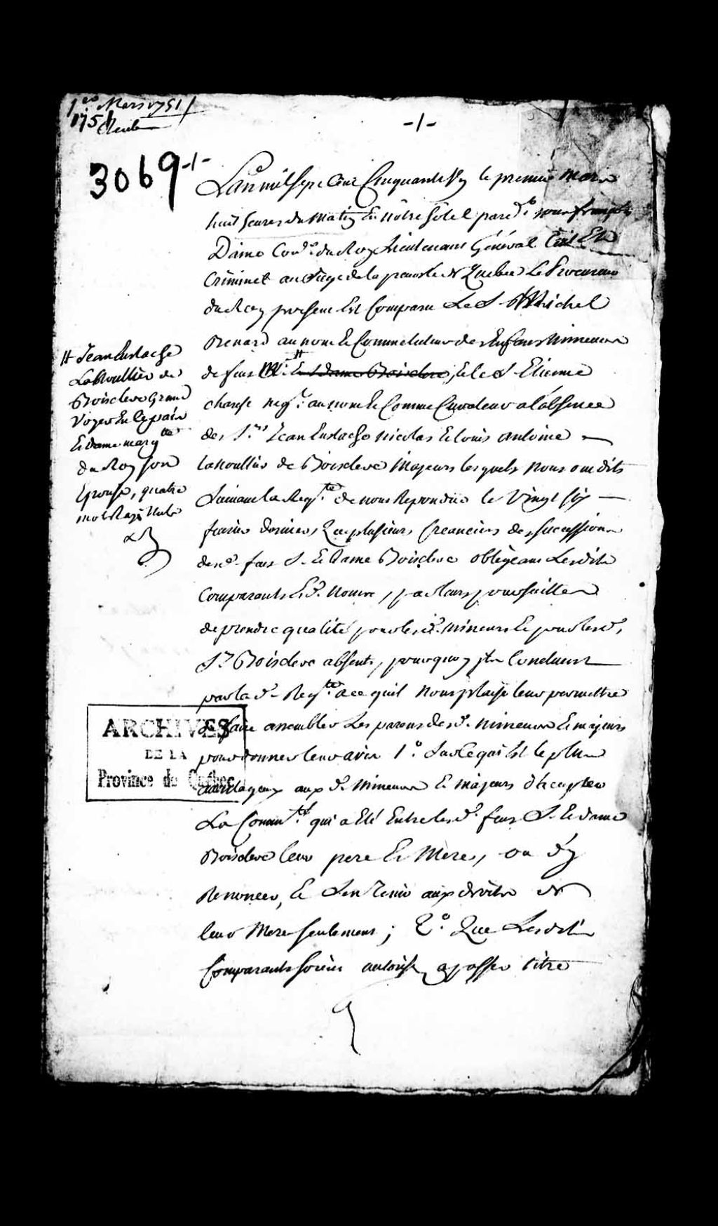 Permission accordée par le juge prévôt Paul-Antoine-François Lanouillier (Lanoullier), sieur Desgrandes (Desgranges), conjointement au sieur Michel Bénard (Besnard), bourgeois de la ville de Québec, au nom et comme tuteur des enfants mineurs des défunts maître Jean-Eustache Lanouillier (Lanoullier), sieur de Boisclerc, conseiller du roi et grand voyer, et de dame Marguerite Duroy, et au sieur Étienne Charet, au nom et comme curateur en l'absence des sieurs Jean-Eustache-Nicolas et Louis-Antoine Lanouillier (Lanoullier) de Boisclerc, fils desdits défunts, à la suite des délibérations des parents et amis desdits enfants mineurs, de renoncer à la communauté qui a été entre lesdits défunts qui leur est plus onéreuse que profitable, de remettre à Prisque Lessard le contrat de vente d'une terre située au Gros-Pin et de vendre certaines terres situées à Saint-Romain, Saint-Pierre et à la petite rivière Saint-Charles en les faisant crier au plus offrant suivant la coutume, 1er mars 1751, Archives nationales à Québec, Collection Pièces judiciaires et notariales, (03Q,TL5,D3069).