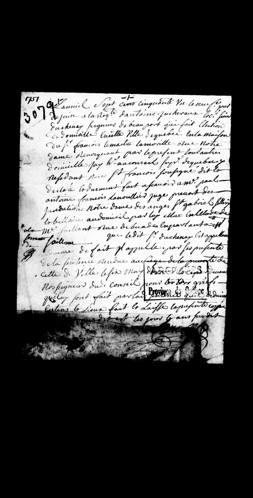 Requête d'Antoine Juchereau, sieur Duchesnay, seigneur de Beauport et de Saint-Roch-des-Aulnaies, qui en appelle de la sentence rendue le 6 mai 1751 au siège de la Prévôté de Québec pour les torts et griefs qui lui ont été causés par ladite sentence, 9 juin 1751, Archives nationales à Québec, Collection Pièces judiciaires et notariales, (03Q,TL5,D3079).