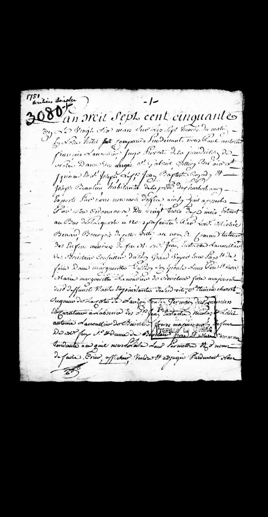 Prestation de serment de Jean-Baptiste Roy dit Audy, habitant de la paroisse de Charlesbourg, et de Joseph Beaulieu, aussi habitant dudit lieu, à titre d'experts pour estimer les terres et prairies situées en trois différents endroits en les seigneuries de Notre-Dame-des-Anges et de Saint-Ignace appartenant à la succession des défunts maître Jean-Eustache Lanouiller (Lanoullier), sieur de Boisclerc, conseiller du roi et grand voyer, et de dame Marguerite Duroy, pour permettre aux héritiers de vendre lesdites terres et prairies, 26 mars 1751, Archives nationales à Québec, Collection Pièces judiciaires et notariales, (03Q,TL5,D3080).