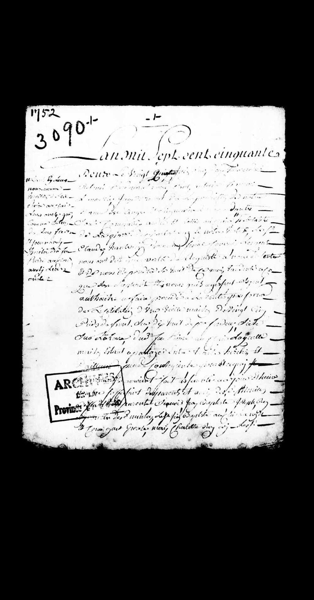 Permission accordée par le juge prévôt Paul-Antoine-François Lanouillier (Lanoullier), sieur Desgrandes (Desgranges), à André et Louis Auclair, tant en leur nom comme héritiers du défunt Pierre Auclair, leur oncle, que comme tuteur dans le cas dudit André Auclair de leurs frères et s¿urs mineurs, à la suite des délibérations des parents et amis desdits enfants mineurs, de vendre une vieille maison située sur la terre du défunt Auclair qui est peu profitable aux 13 héritiers dudit défunt, 24 juin 1752, Archives nationales à Québec, Collection Pièces judiciaires et notariales, (03Q,TL5,D3090).