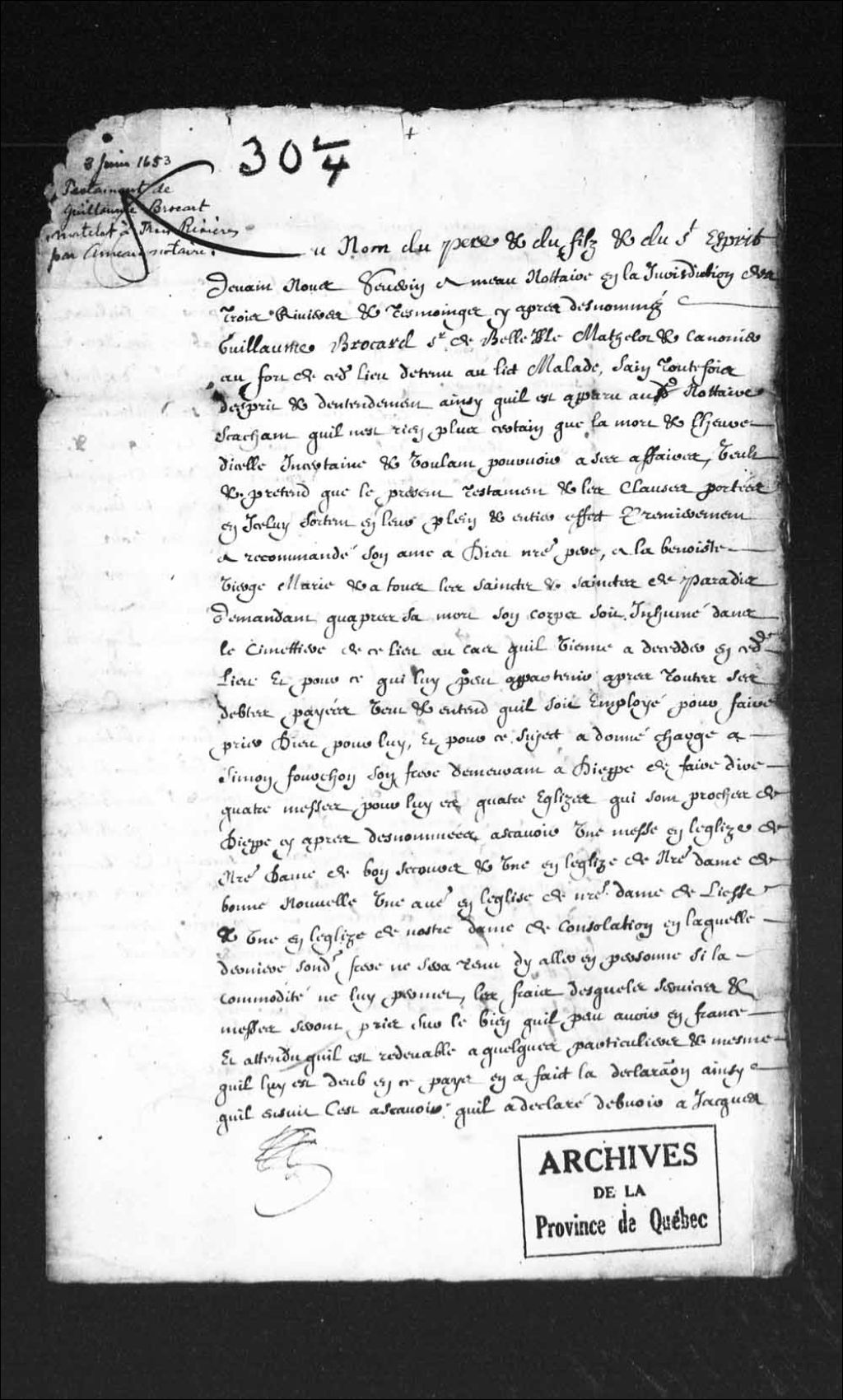 Testament de Guillaume Brocart, sieur de Belle-Isle, matelot et canonnier au fort de Trois-Rivières, Gabriel Pelletier, témoin, 3 juin 1653, Archives nationales à Québec, Collection Pièces judiciaires et notariales, (03Q,TL5,D30,P25).