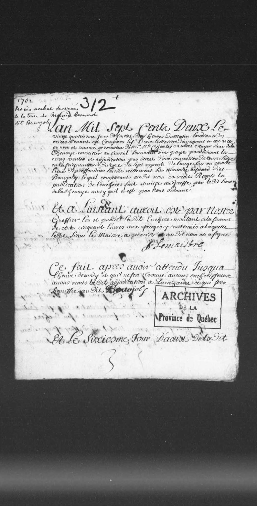 Procès-verbal de criée et vente par adjudication et décret de la terre de Maurice Bénard (Besnard) dit Bourjoli, située en la seigneurie de Saint-Roch, à la Juridiction royale des Trois-Rivières, sur la requête du sieur Charles Aubert de La Chesnaye (Lachesnaye), conseiller au Conseil souverain de Québec; comparution du sieur Pierre Lemaître, procureur du sieur Aubert, Barthélémy David, habitant de la seigneurie de Dutort, Michel Godefroy, écuyer, sieur de Linctot (Lintot), major de la ville des Trois-Rivières, 24 juillet 1702, Archives nationales à Québec, Collection Pièces judiciaires et notariales, (03Q,TL5,D312).