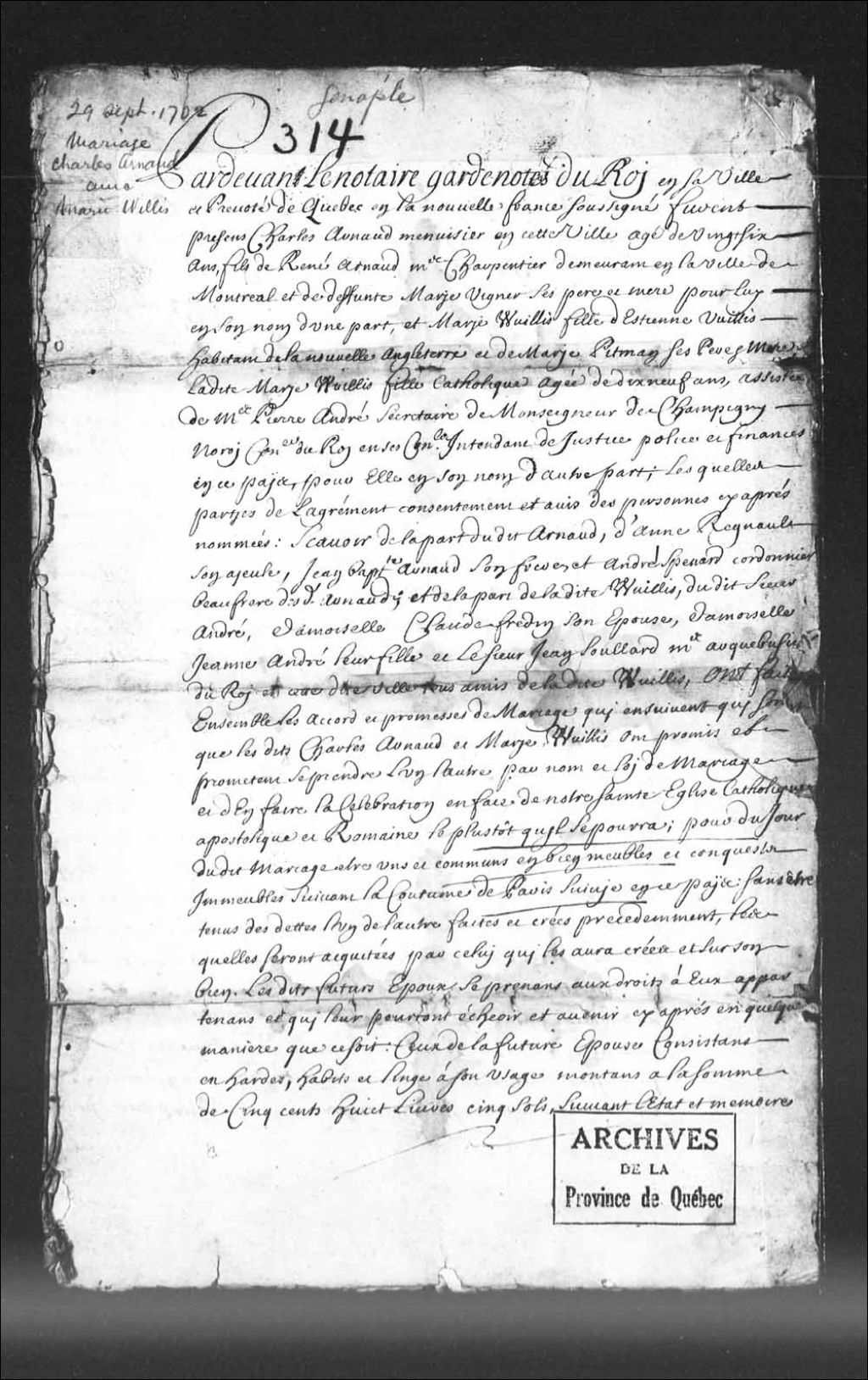 - Contrat de mariage de Charles Arnaud, menuisier de Québec, âgé de 26 ans, fils de René Arnaud, maître charpentier, demeurant à Montréal et de défunte Marie Vigner, d'une part, et de Mary Willis, âgée de 19 ans, catholique et fille de Etienne Willis et de Marie Pitman, demeurant en la Nouvelle-Angleterre