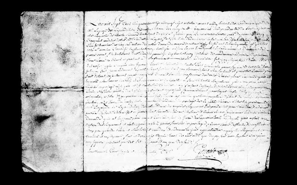 Déclaration de André Genest, huissier de la juridiction de Notre-Dame-des-Anges, résidant en la côte Saint-Martin de la paroisse de Charlesbourg en la seigneurie Saint-Gabriel, à l'effet qu'il a remis une assignation à comparaître à Pierre Verret fils, habitant de ladite paroisse, le premier jeudi après la Saint-Martin à la suite de la requête de Charles Renaud, habitant à Charlesbourg près de la Nouvelle-Lorette en le fief Saint-Gabriel, ledit Verret n'ayant pas respecté l'ordonnance interdisant de briser des clôtures pour s'ouvrir un passage pour la chasse et qui refuse de payer l'amende de 12 livres ainsi que les réparations des dommages qu'il a causés, 27 octobre 1756, Archives nationales à Québec, Collection Pièces judiciaires et notariales, (03Q,TL5,D3154-5).