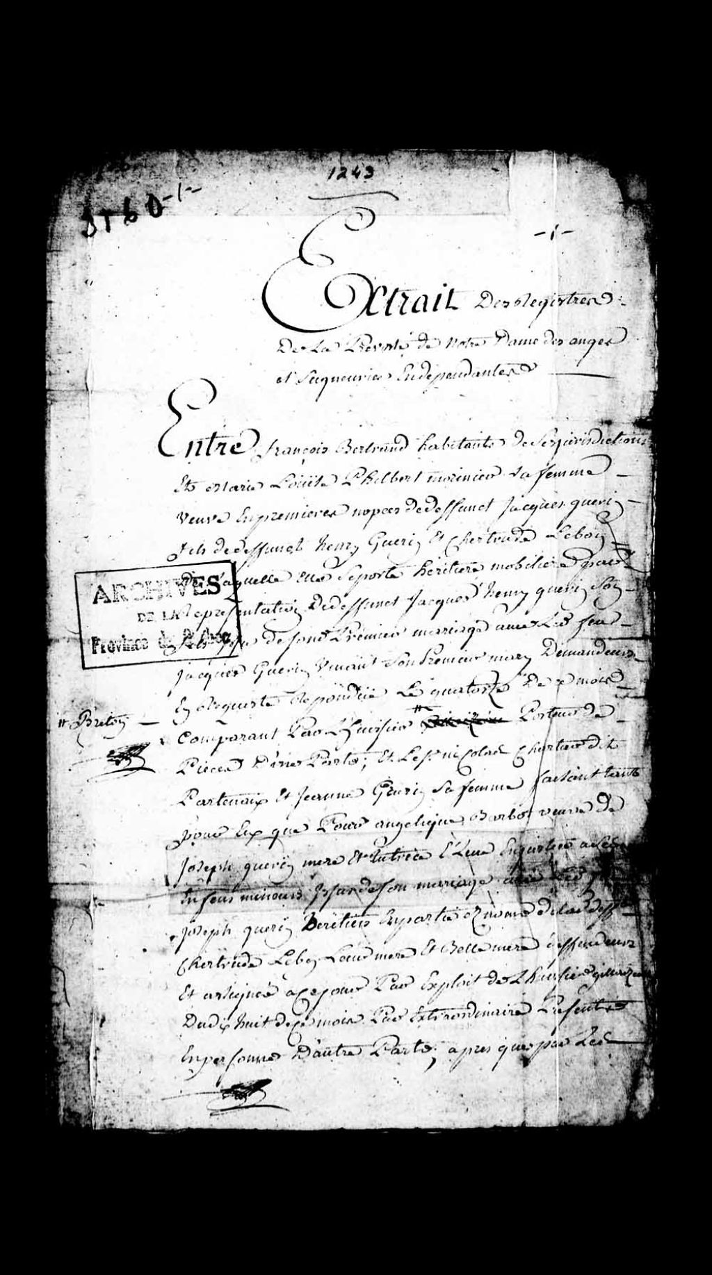 Report de la sentence de Louis Courville, notaire royal, dans la cause opposant François Bertrand, habitant de Notre-Dame-des-Anges, et sa femme Marie-Louise-Philbert Morinier, veuve en premières noces de Jacques Guérin, fils des défunts Henri Guérin et Gertrude Bon dit Lacombe de laquelle elle se porte héritière mobilière pour le défunt Jacques Henri Guérin, son fils issu de son mariage avec le défunt Jacques Guérin, au sieur Nicolas Chartier dit Parthenay et sa femme Jeanne Guérin ainsi qu'à Angélique Barbeau, veuve de Joseph Guérin, mère et tutrice des enfants mineurs issus de son mariage avec le défunt Joseph Guérin, héritiers en partie de la défunte Bon, concernant les droits à l'héritage de ladite défunte Bon, et ordonnance à l'effet que les pièces resteront au greffe pour en être délibérées au premier jour d'audience, 19 février 1756, Archives nationales à Québec, Collection Pièces judiciaires et notariales, (03Q,TL5,D3160-1).