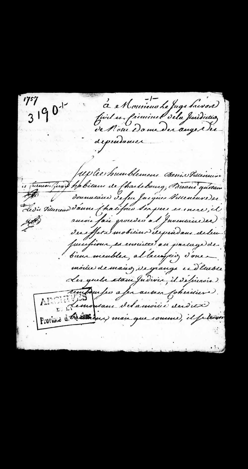 Requête de Denis Villeneuve, habitant de Charlesbourg, donataire des défunts Jacques Villeneuve et Anne Chalifou, ses parents, et de François Girard, tuteur de Marie Girard, enfant mineure issue de son mariage avec Marie-Geneviève Villeneuve, fille desdits défunts, demandant la permission de nommer conjointement avec les autres cohéritiers qui sont en accord des arbitres qui dresseront leur procès-verbal sur l'estimation des bâtiments indivisibles de la succession desdits défunts pour que ledit Denis Villeneuve puisse remettre la somme équivalant à la moitié de la valeur desdits bâtiments auxdits cohéritiers, 17 juin 1757, Archives nationales à Québec, Collection Pièces judiciaires et notariales, (03Q,TL5,D3190-1).