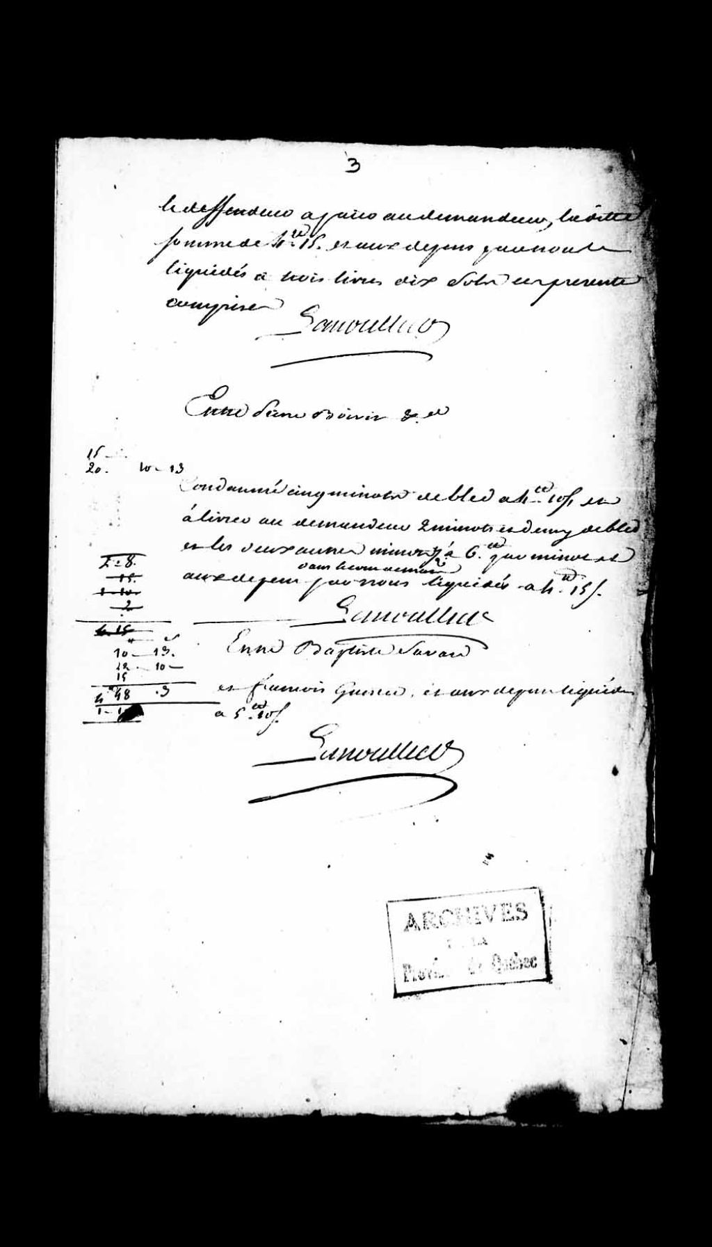 Jugement rendu par le juge prévôt Paul-Antoine-François Lanouillier (Lanoullier), sieur Desgrandes (Desgranges), condamnant André Auclair à payer au demandeur cinq minots de blé au prix de 4 livres 10 sols le minot et à livrer deux minots et demi de blé dans le mois de mars et à payer les deux autres minots et demi à 6 livres le minot, 2 février 1758, Archives nationales à Québec, Collection Pièces judiciaires et notariales, (03Q,TL5,D3194-22).