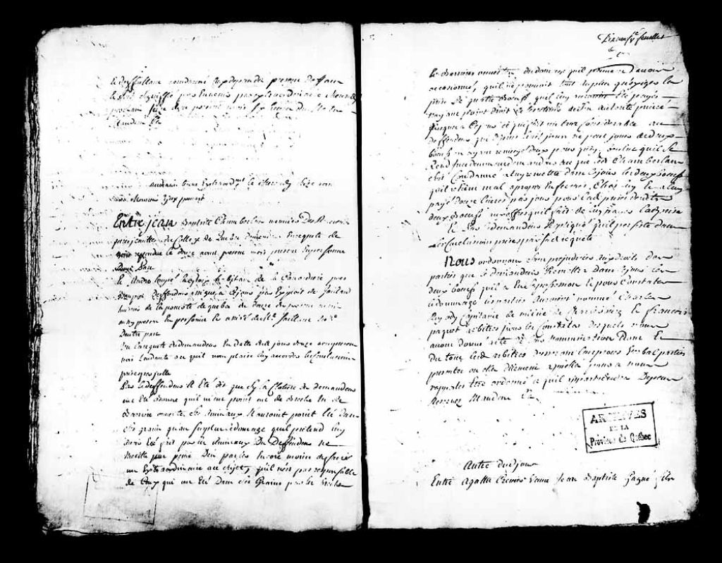 Jugement rendu par le juge prévôt Paul-Antoine-François Lanouillier (Lanoullier), sieur Desgrandes (Desgranges), en faveur de Agathe Crevier, veuve de Jean-Baptiste Gagné fils, habitant de la paroisse de L'Ancienne-Lorette, au nom et comme tutrice des enfants mineurs issus de son mariage avec le défunt Gagné, dans la cause l'opposant à Jean-Baptiste Gagné père, aussi habitant dudit lieu, lequel Gagné père est comdamné, selon le contrat de donation envers ladite Crevier qu'il s'était engagé à respecter avec sa femme, à loger et nourrir la demanderesse et ses enfants et leur donner toutes les choses nécessaires à leur entretien et nécessité, à remettre à ladite demanderesse en nature dans trois jours les bestiaux (animaux), meubles et ustensiles de ménage lui appartenant ou à rembourser en argent à ladite demanderesse ce qu'il a déjà vendu, et défense audit Gagné père de vendre à l'avenir ce qui appartient à ladite demanderesse et à ses enfants selon ledit contrat de donation, 16 août 1758, Archives nationales à Québec, Collection Pièces judiciaires et notariales, (03Q,TL5,D3195-40).