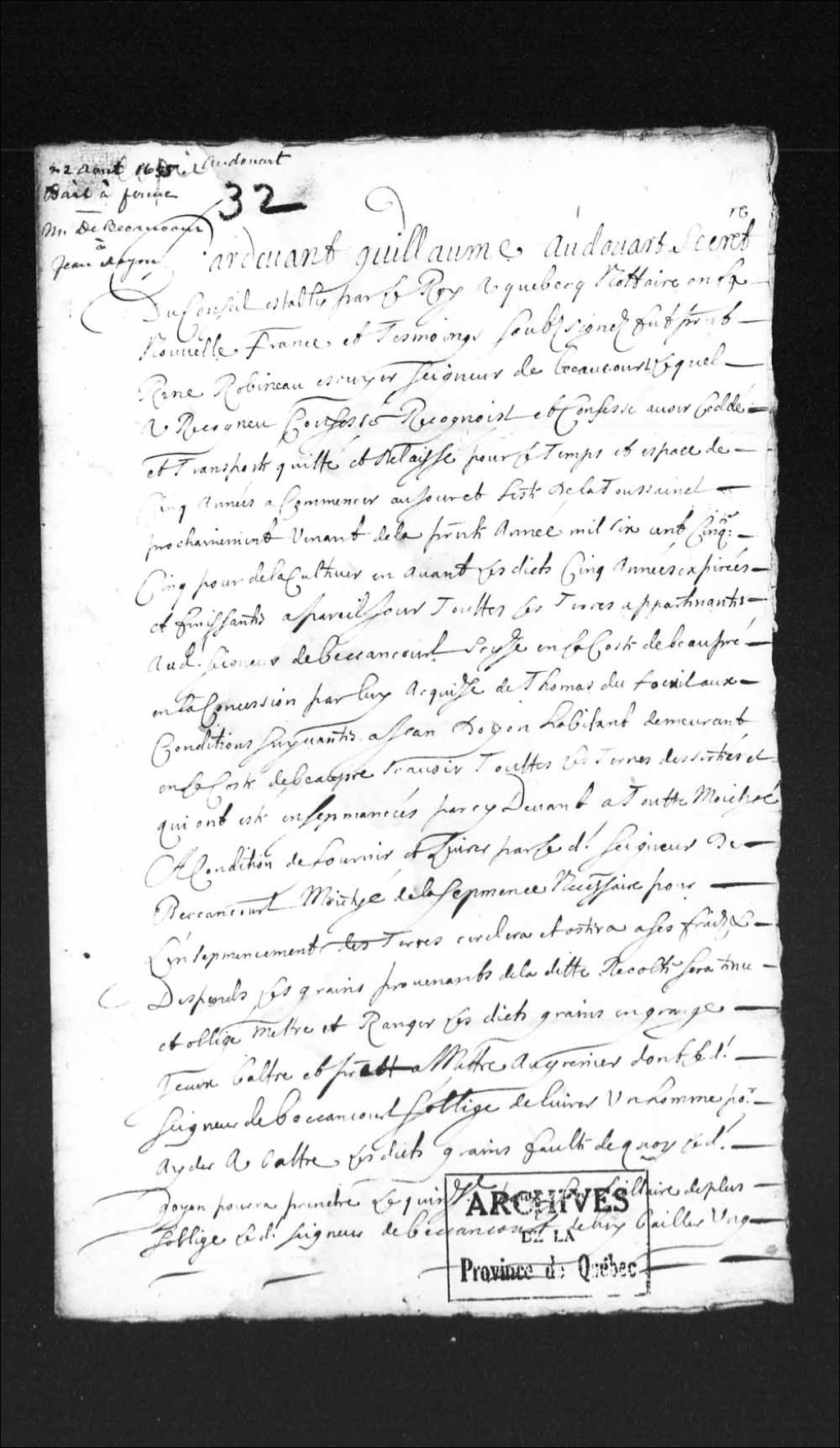 Bail d'une terre d'une terre que possède le sieur René Robineau, seigneur de Bécancour, à la côte de Beaupré, à Jean Doyon